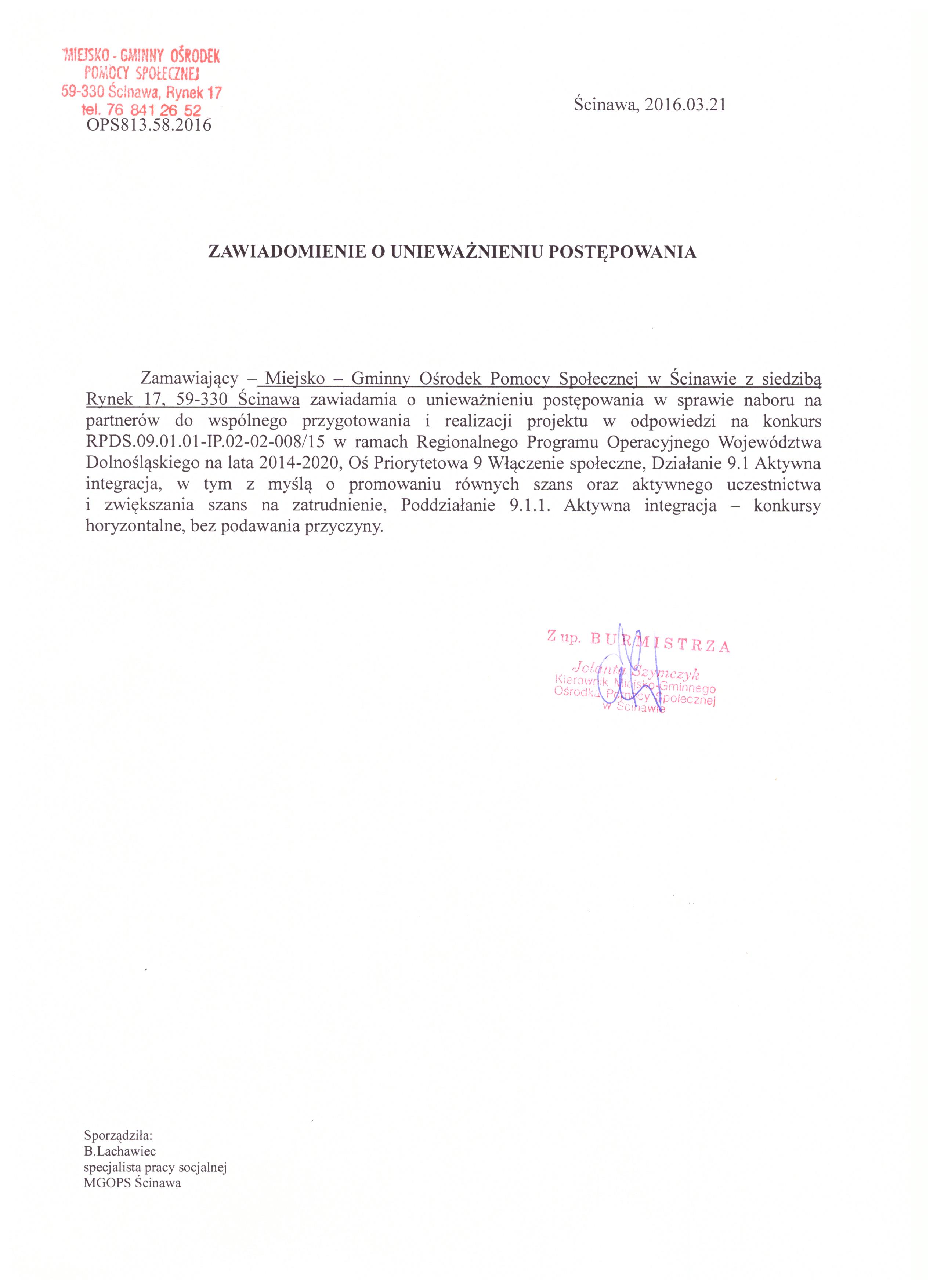 Tytuł dokumentu: | Zawiadomienie o unieważnieniu ogłoszenia o otwartym naborze partnera w celu wspólnej realizacji projektu w zakresie aktywnej integracji | |