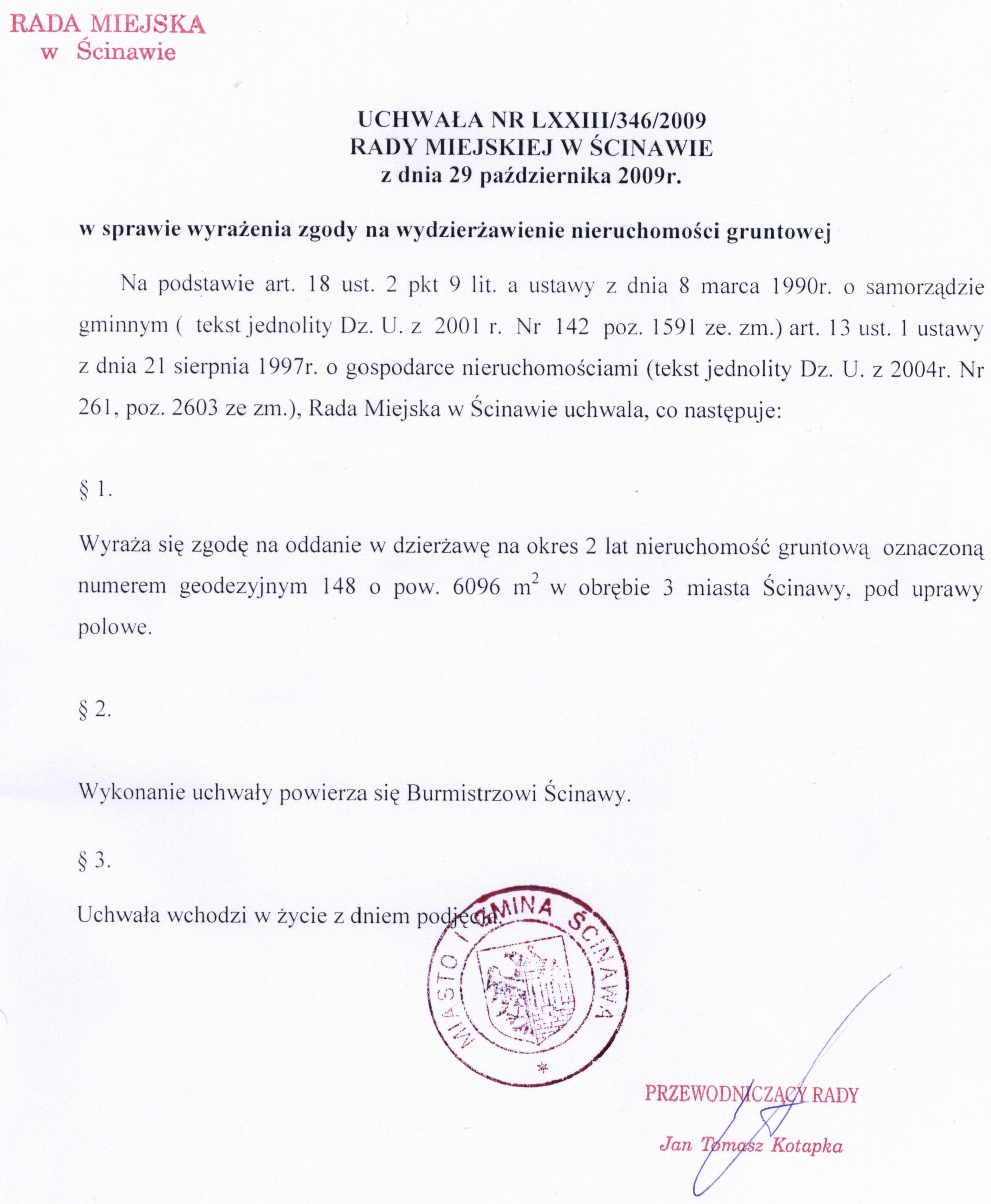 Tytuł dokumentu: | Uchwała nr LXXIII/346/2009 Rady Miejskiej w Ścinawie z dnia 29 października 2009 | |
