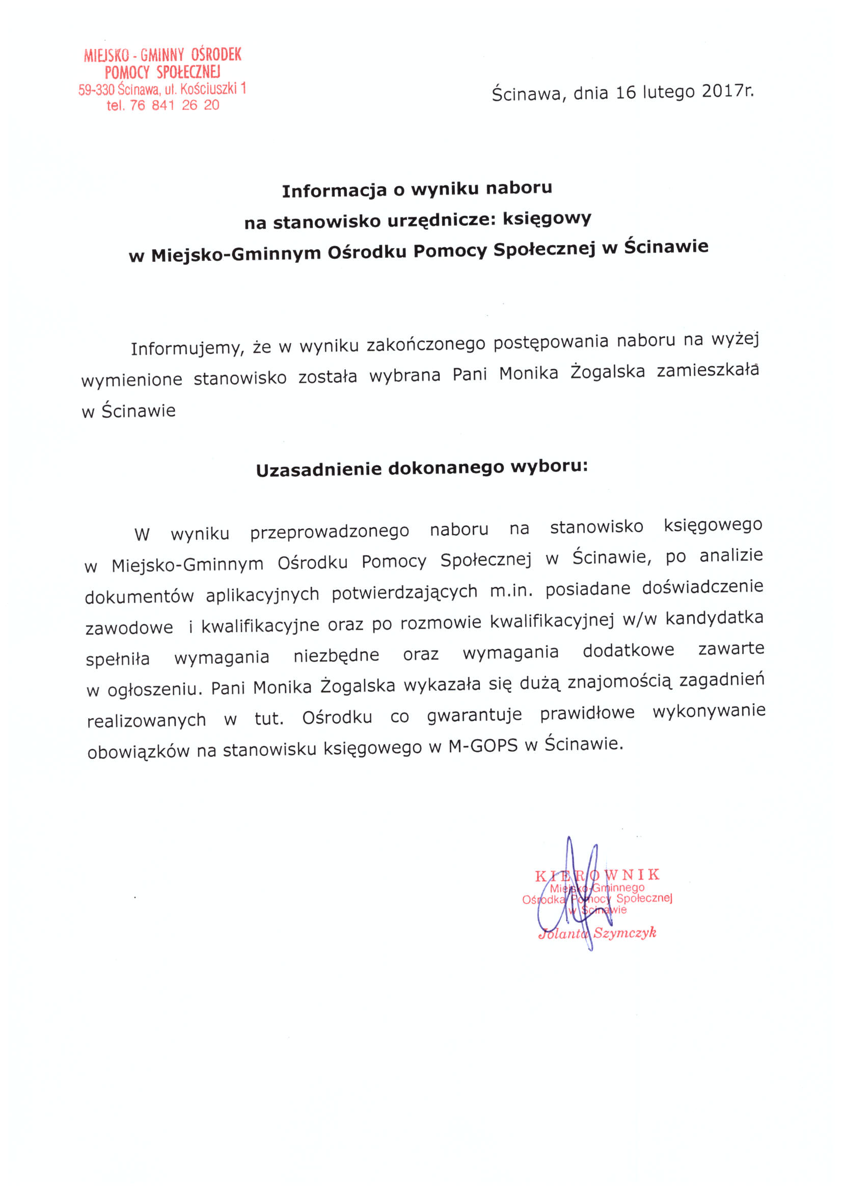 Tytuł dokumentu: | Informacja o wynikach naboru na stanowisko urzędnicze: księgowy w Miejsko-Gminnym Ośrodku Pomocy Społecznej w Ścinawie | |