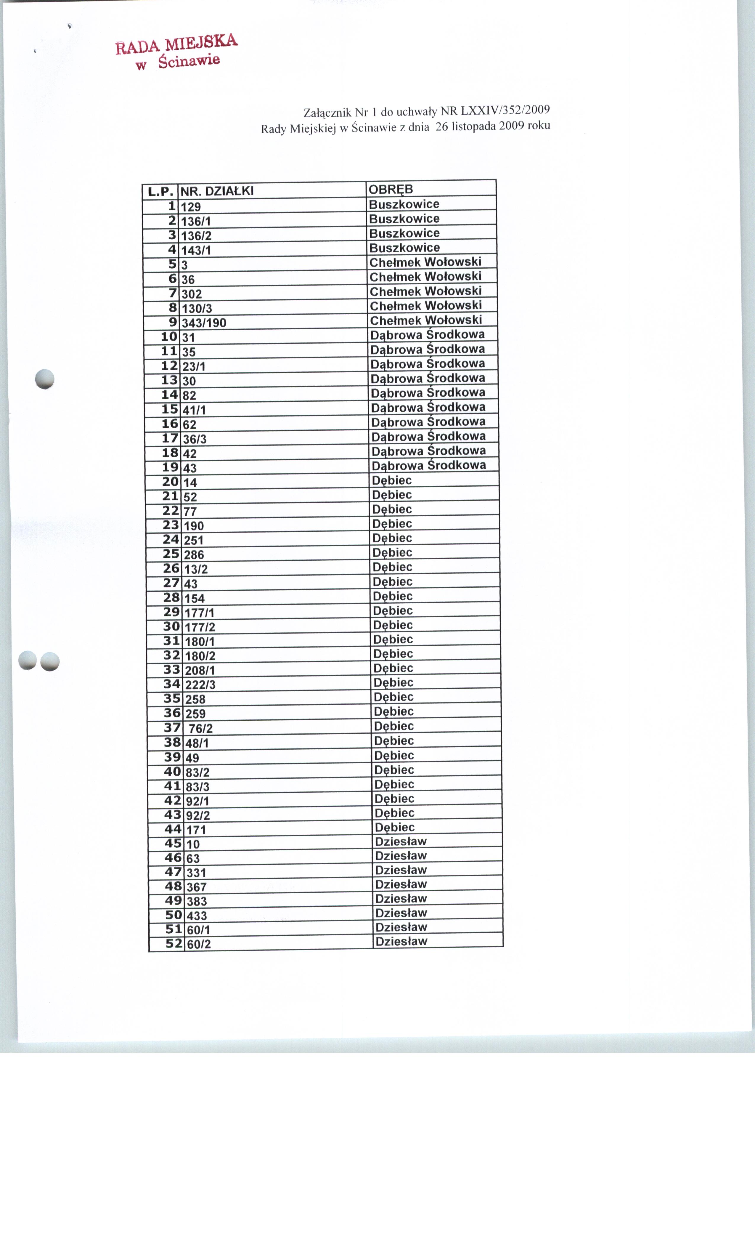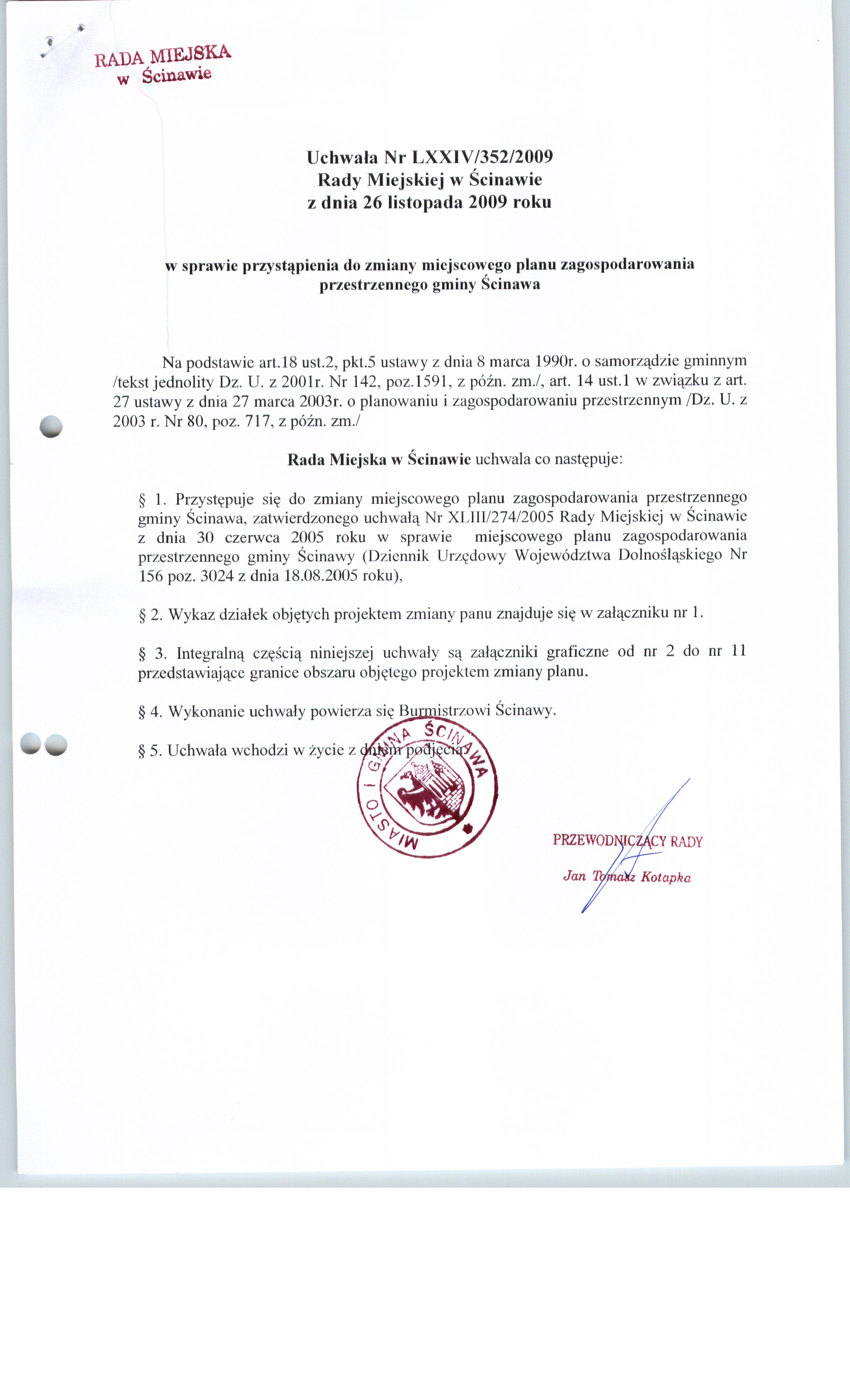 Uchwała nr LXXIV/352/2009 Rady Miejskiej w Ścinawie z dnia 26 listopada 2009