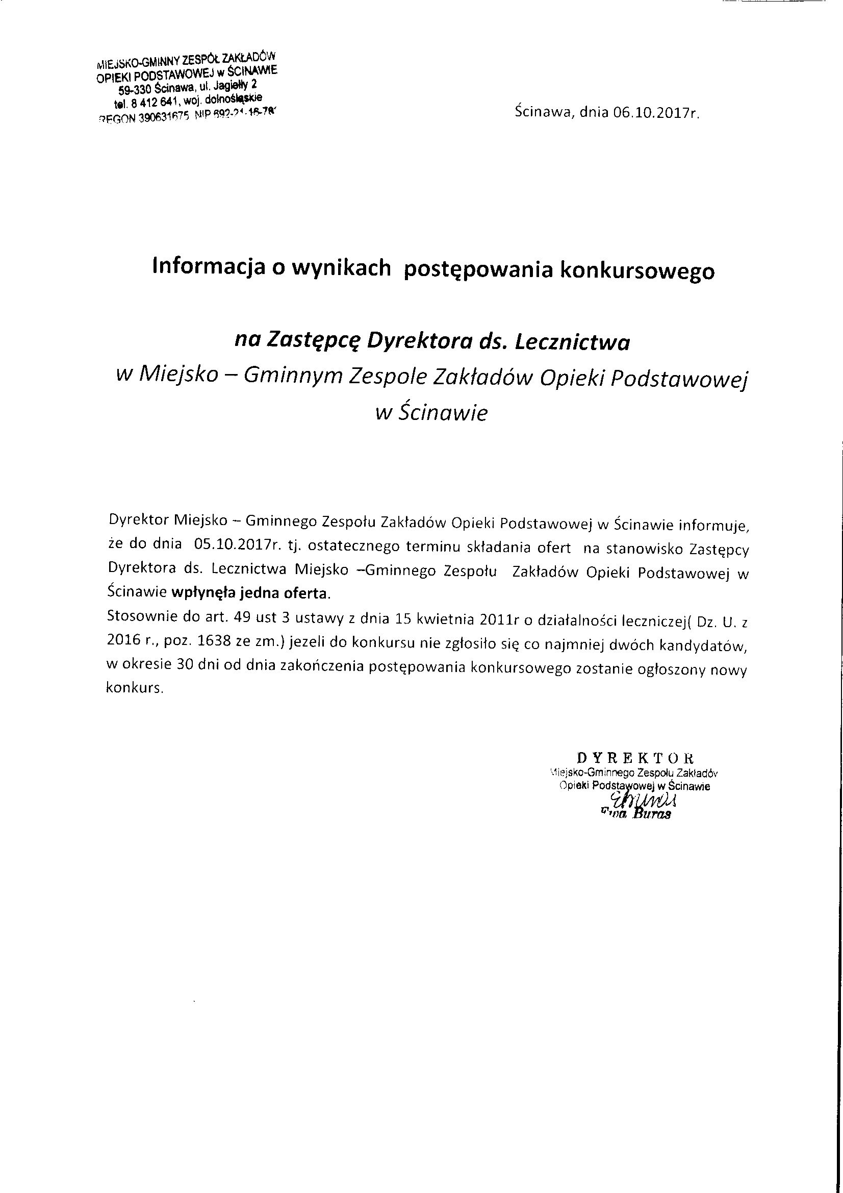 Tytuł dokumentu: | Informacja o wynikach postępowania konkursowego na Zastępcę Dyrektora ds. Lecznictwa w Miejsko-Gminnym Zespole Zakładów Opieki Podstawowej w Ścinawie. | |