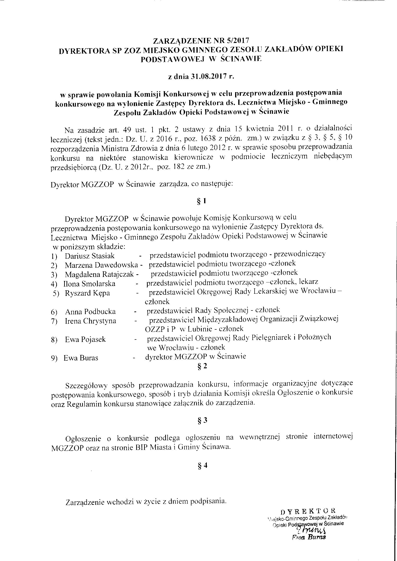 Tytuł dokumentu: | Drugie ogłoszenie o konkursie na Zastępcę Dyrektora ds. Lecznictwa w Miejsko-Gminnym Zespole Zakładów Opieki Podstawowej w Ścinawie. | |