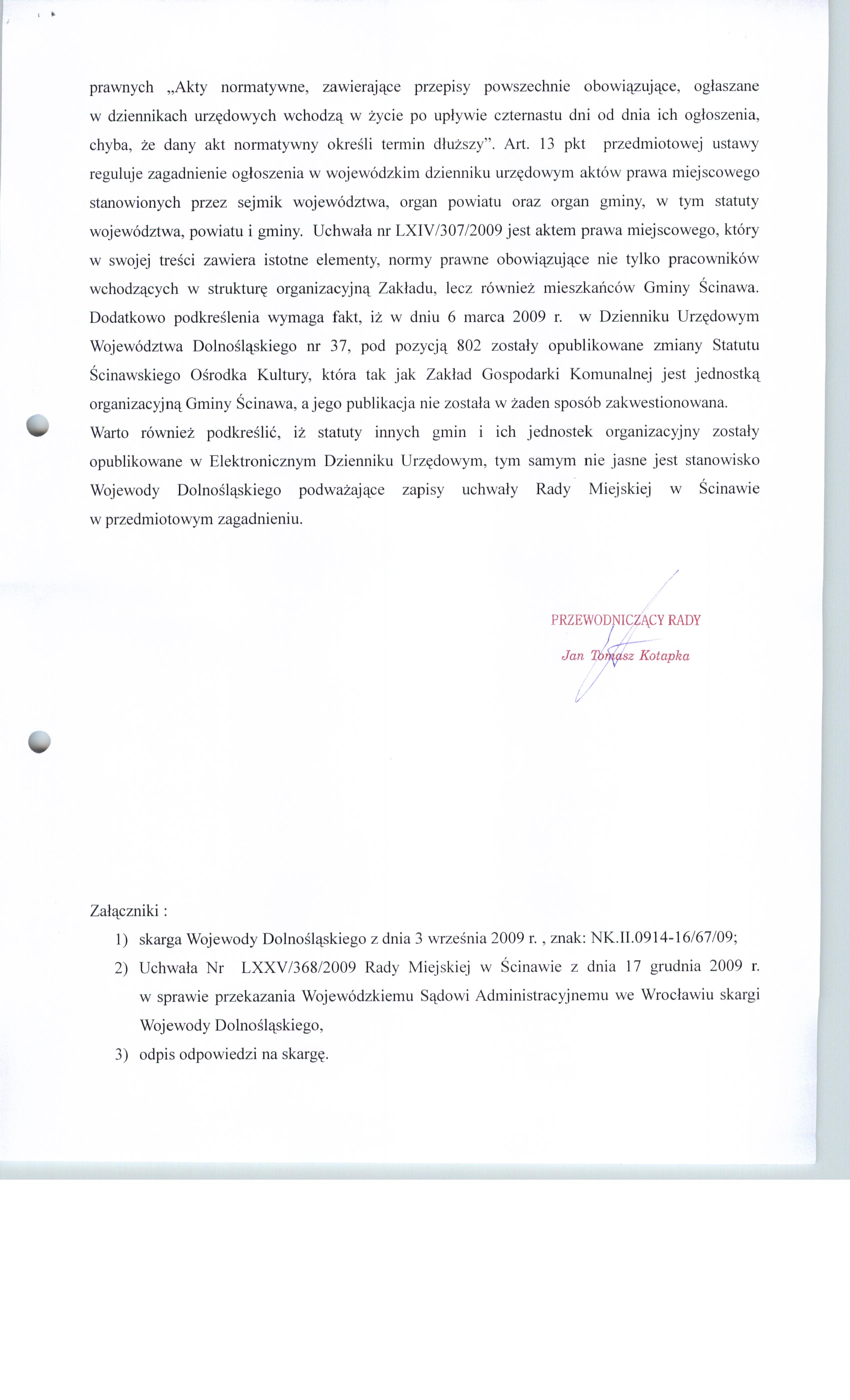 Uchwała nr LXXV/368/2009 Rady Miejskiej w Ścinawie z dnia 17 grudnia 2009