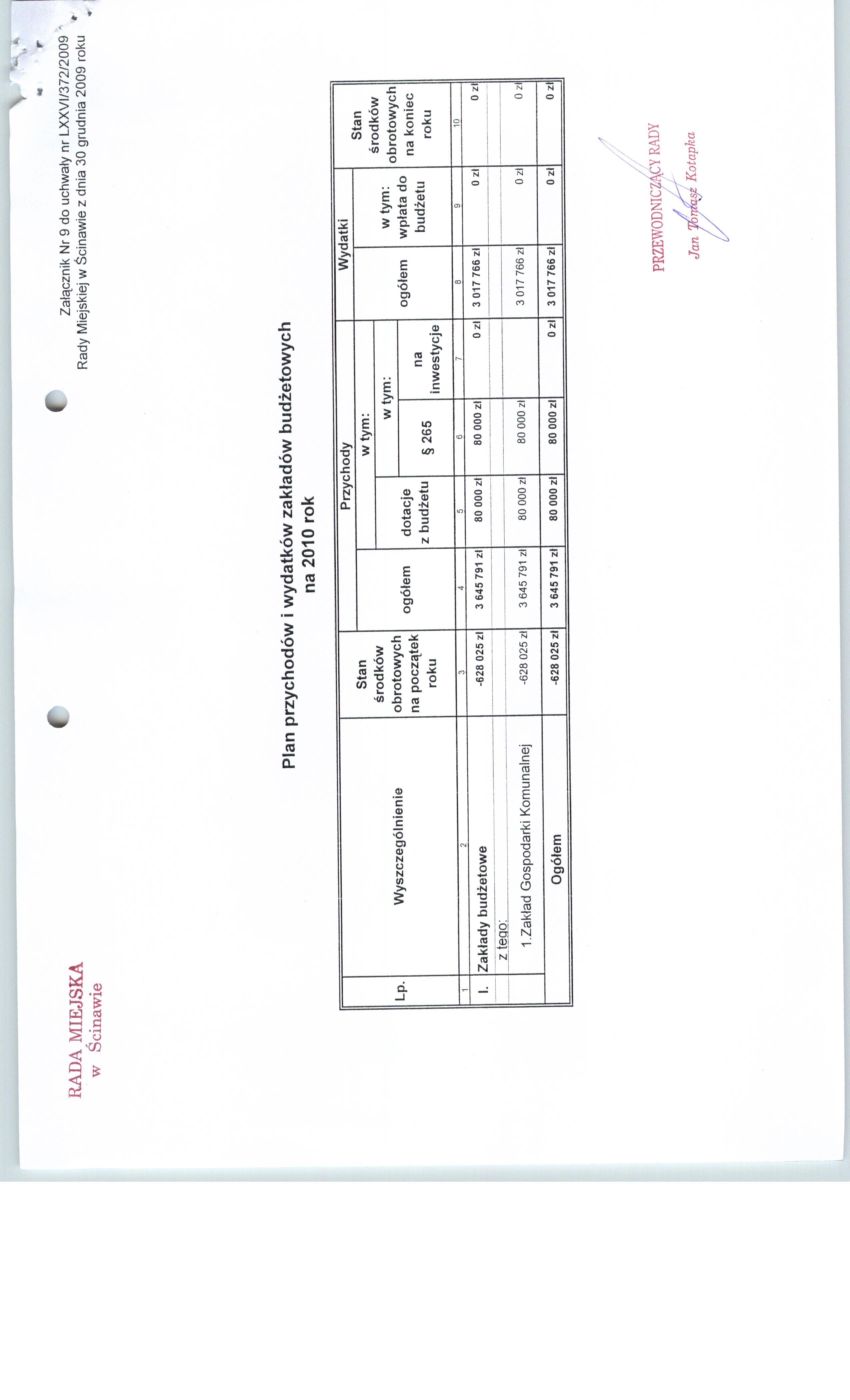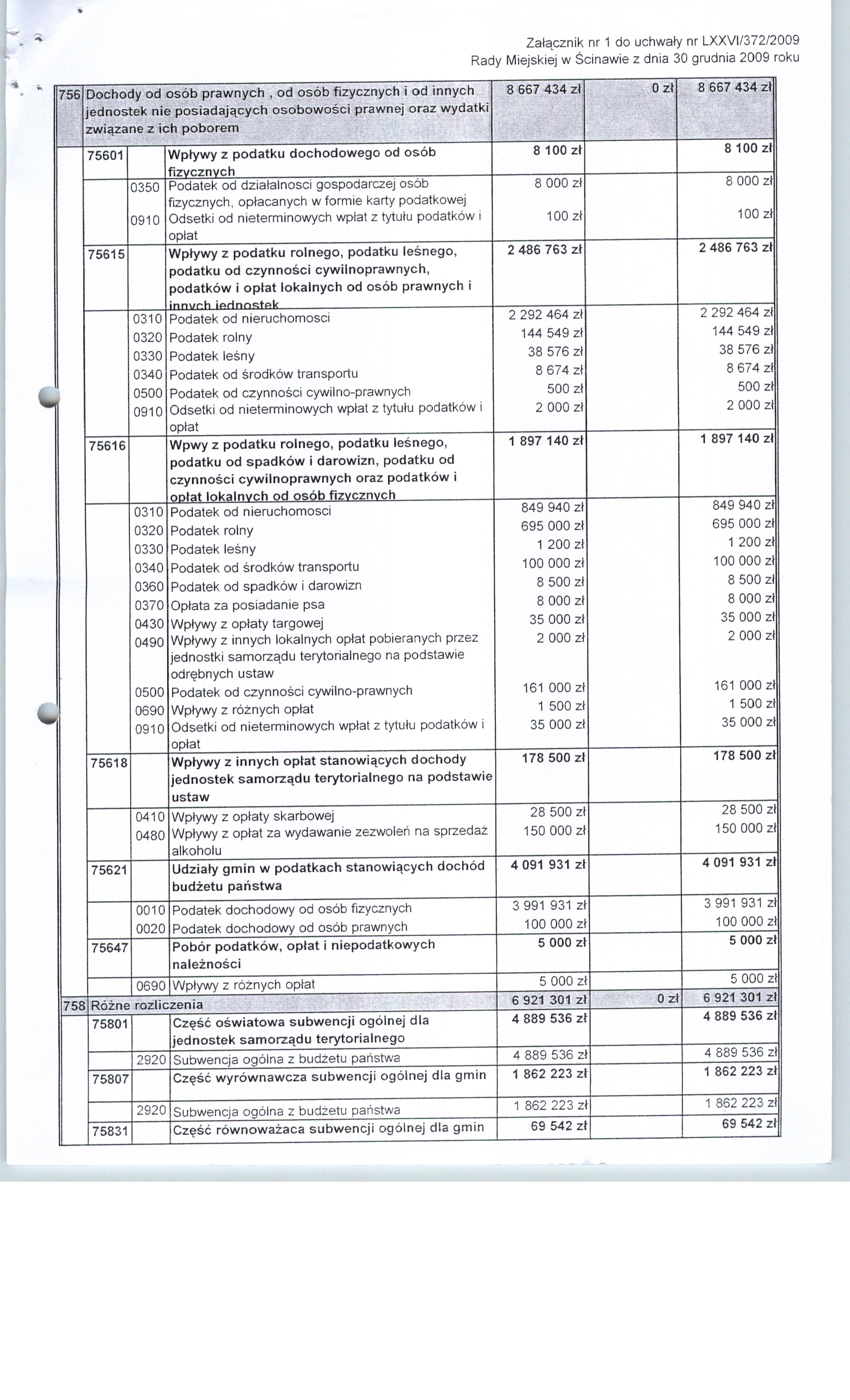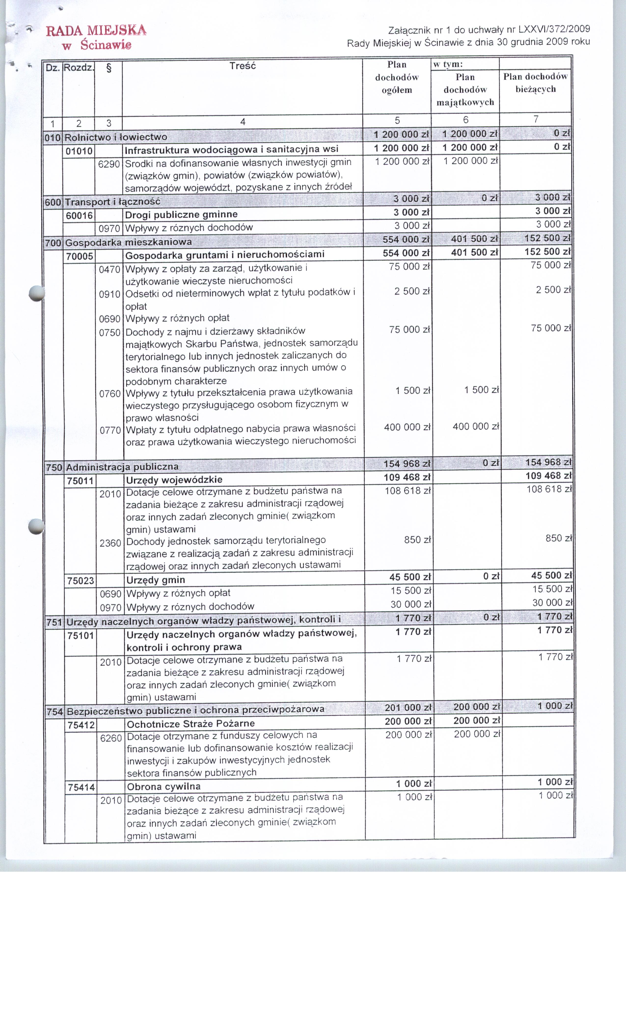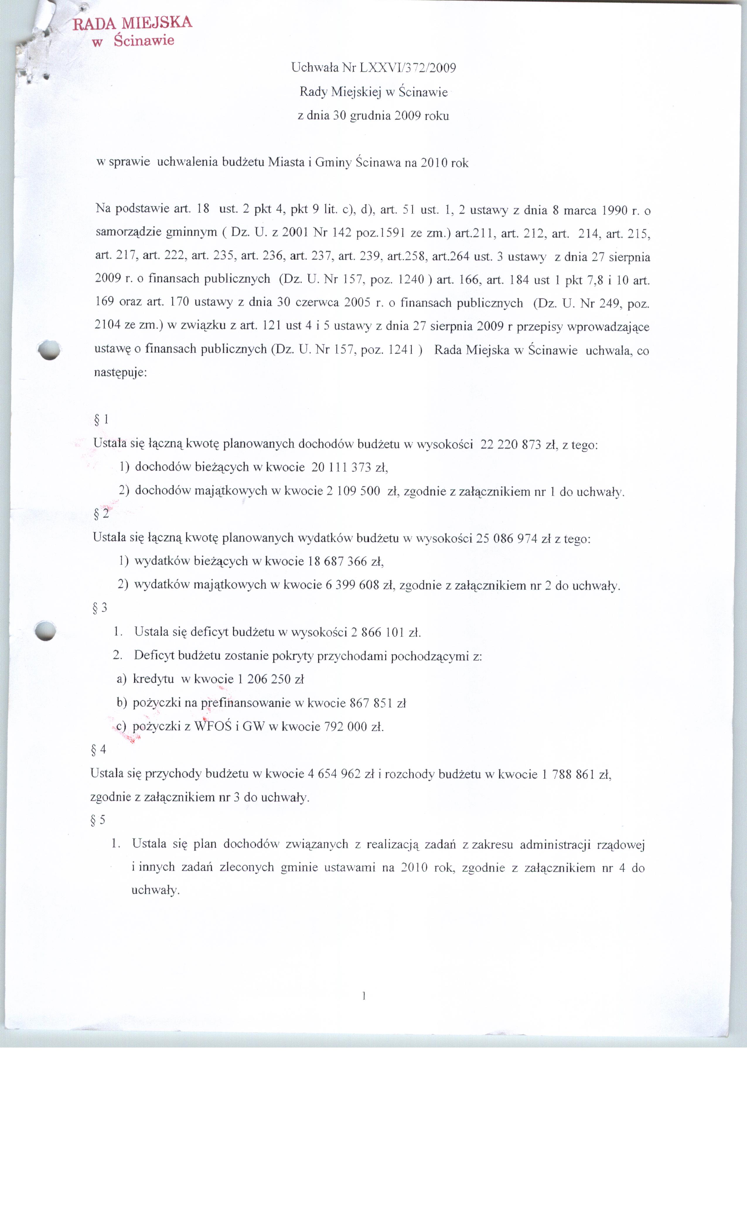 Uchwała nr LXXVI/372/2009 Rady Miejskiej w Ścinawie z dnia 30 grudnia 2009