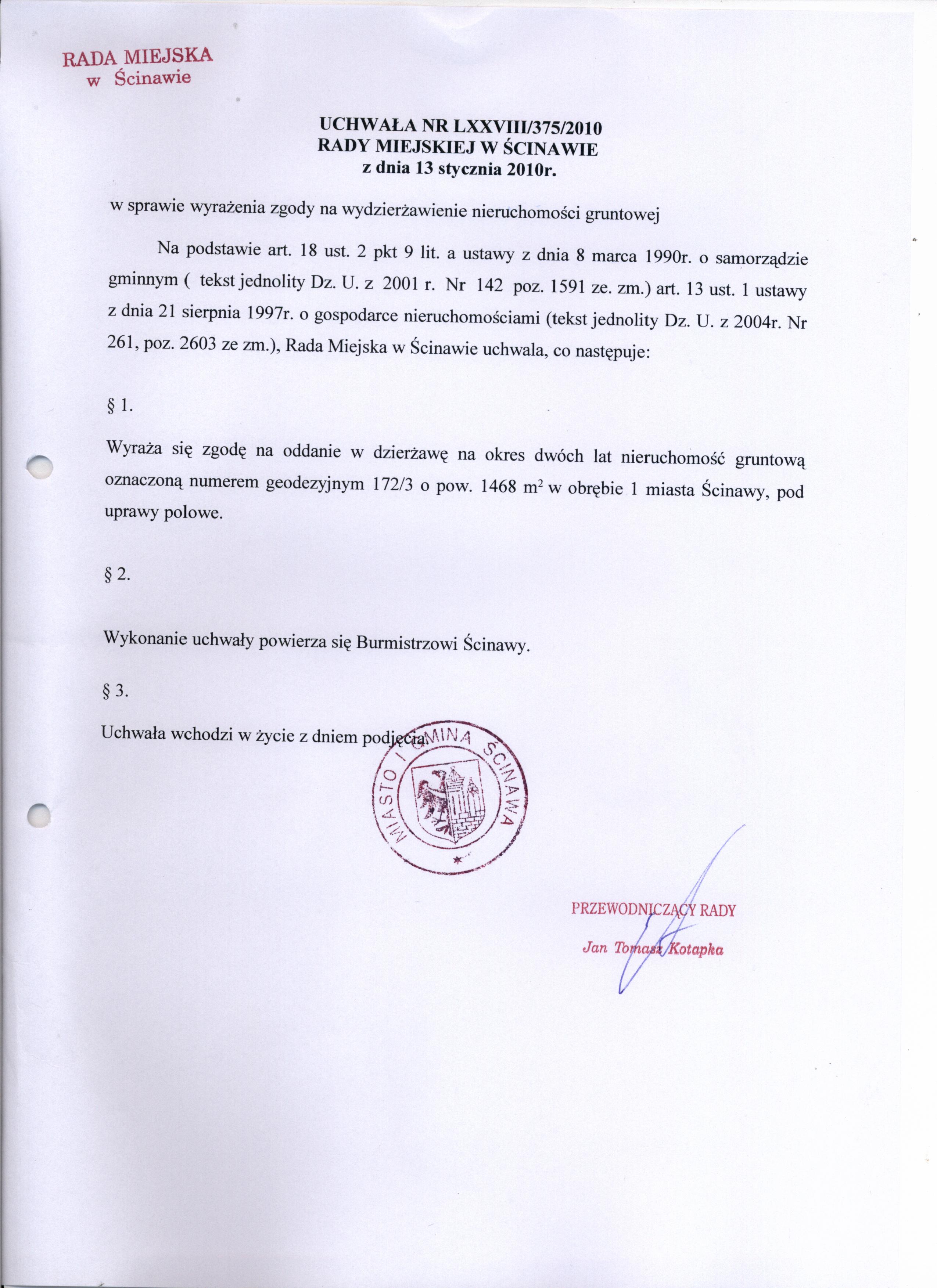 Tytuł dokumentu: | Uchwała Nr LXXVIII/375/10 Rady Miejskiej w Ścinawie z dnia 13 stycznia 2010r. | |