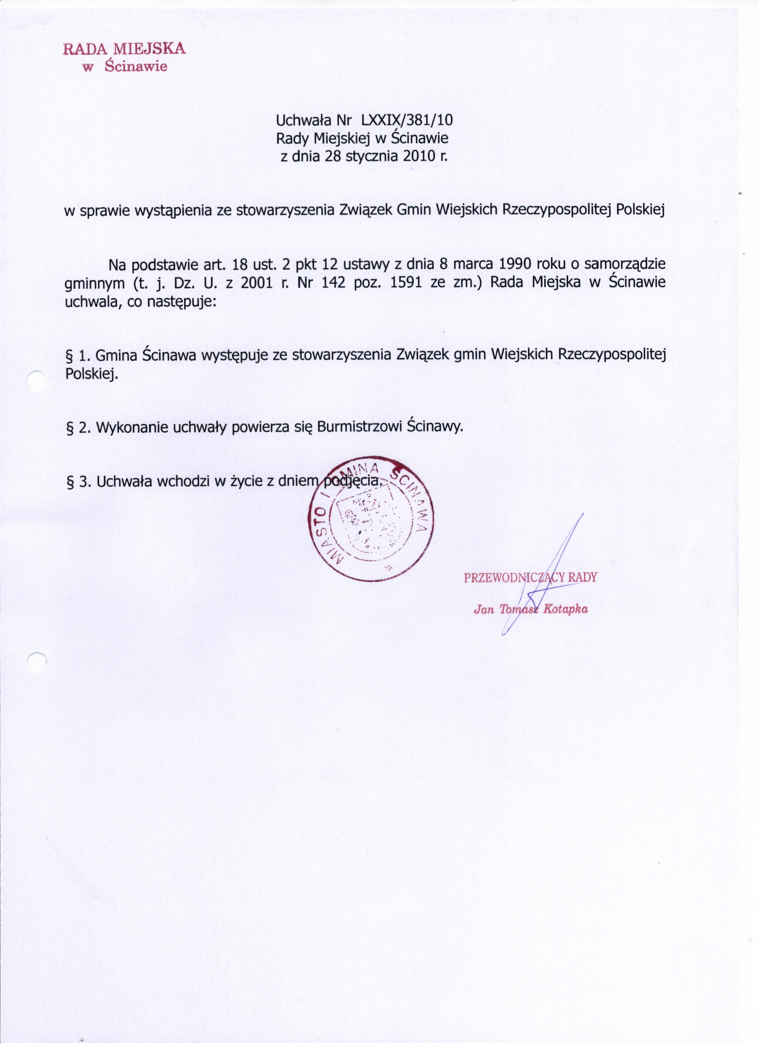 Tytuł dokumentu: | Uchwała Nr LXXIX/381/10 Rady Miejskiej w Ścinawie z dnia 28 stycznia 2010r. | |
