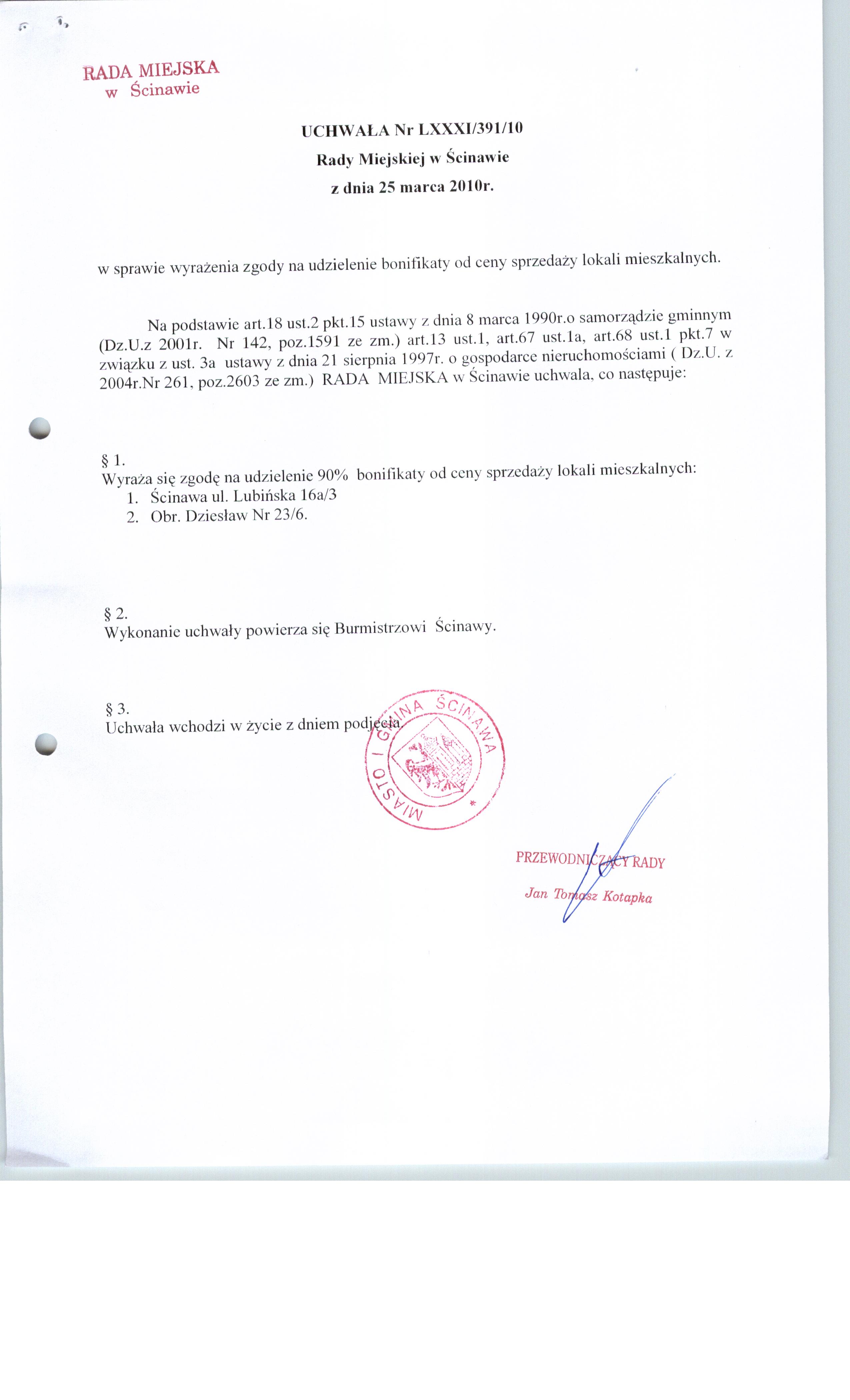 Uchwała Nr LXXXI/391/10 Rady Miejskiej w Ścinawie z dnia 25 marca 2010r.