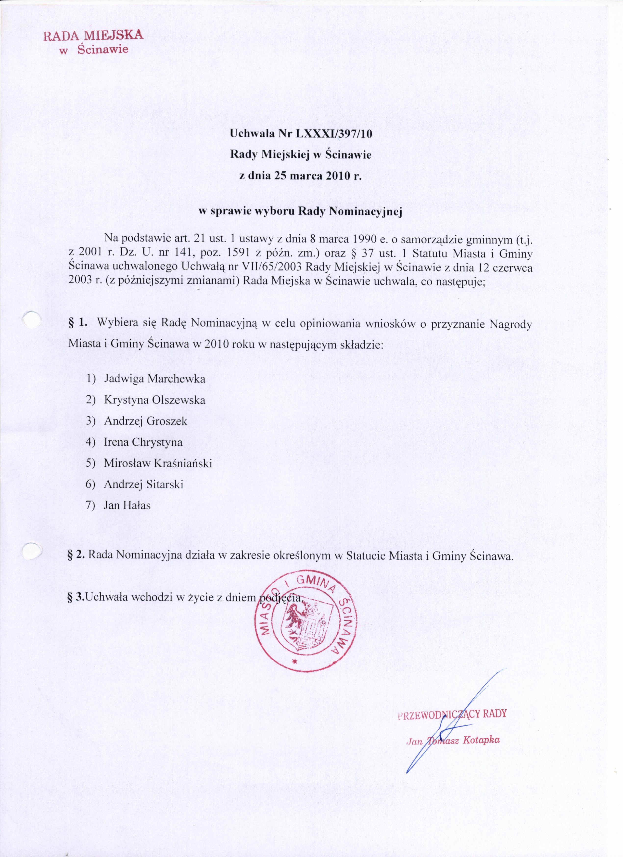 Tytuł dokumentu: | Uchwała Nr LXXXI/397/10 Rady Miejskiej w Ścinawie z dnia 25 marca 2010r. | |