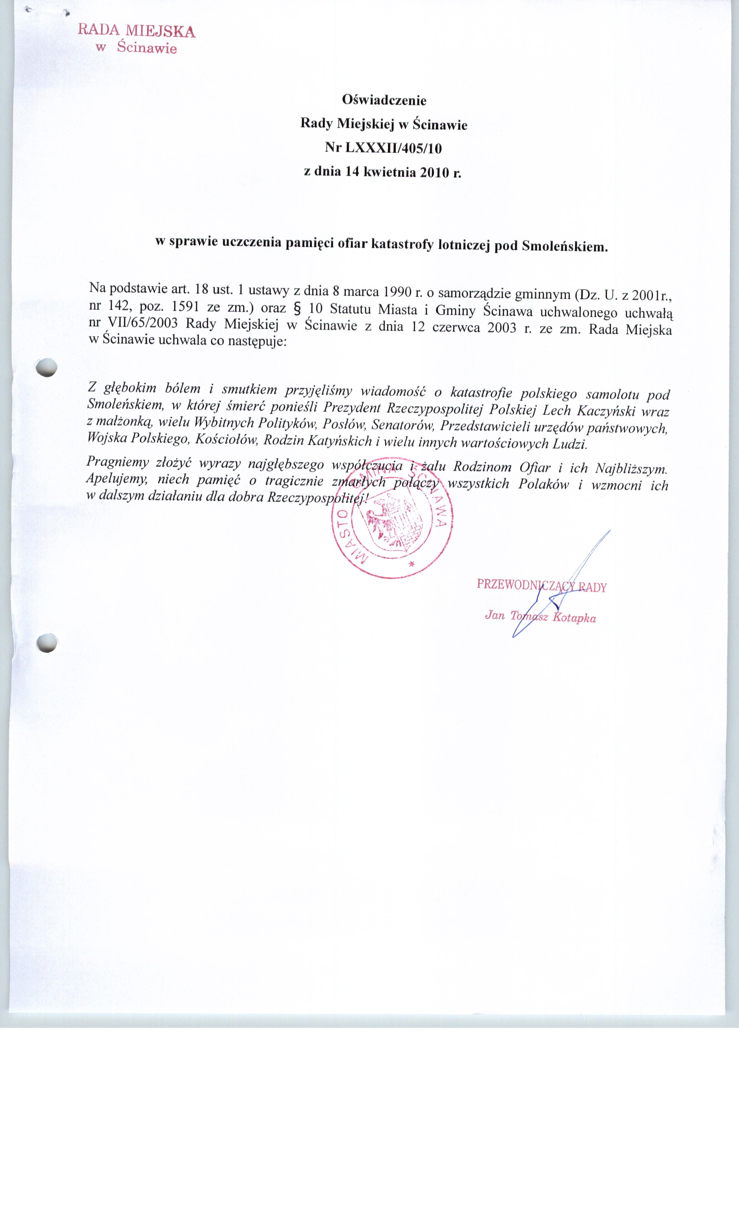 Uchwała Nr LXXXII/405/10 Rady Miejskiej w Ścinawie z dnia 14 kwietnia 2010r.