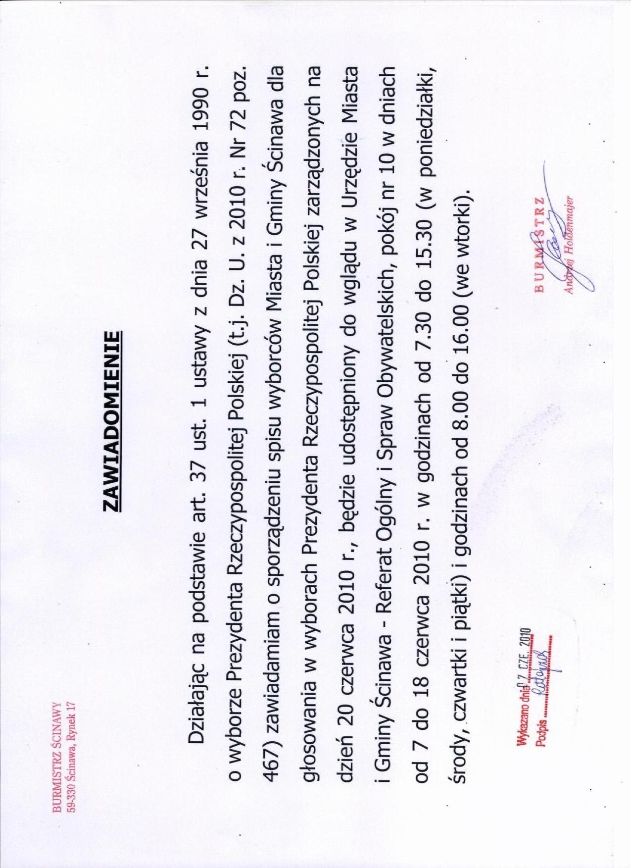 Tytuł dokumentu: | Zawiadomienie o sporządzeniu spisu wyborców Miasta i Gminy Ścinawa dla głosowania w wyborach Prezydenta Rzeczypospolitej Polskiej zarządzonych na dzień 20 czerwca 2010 r. | |