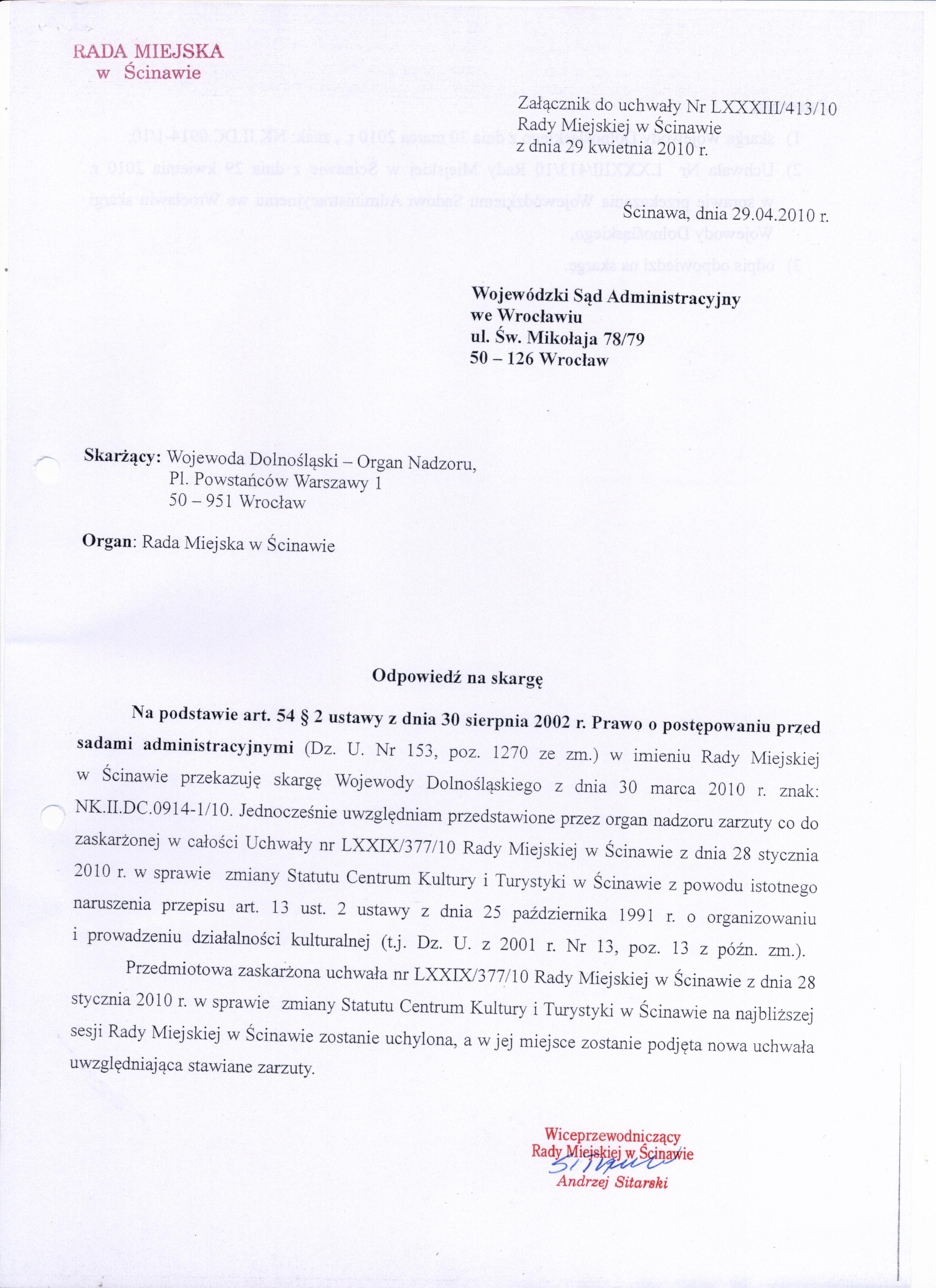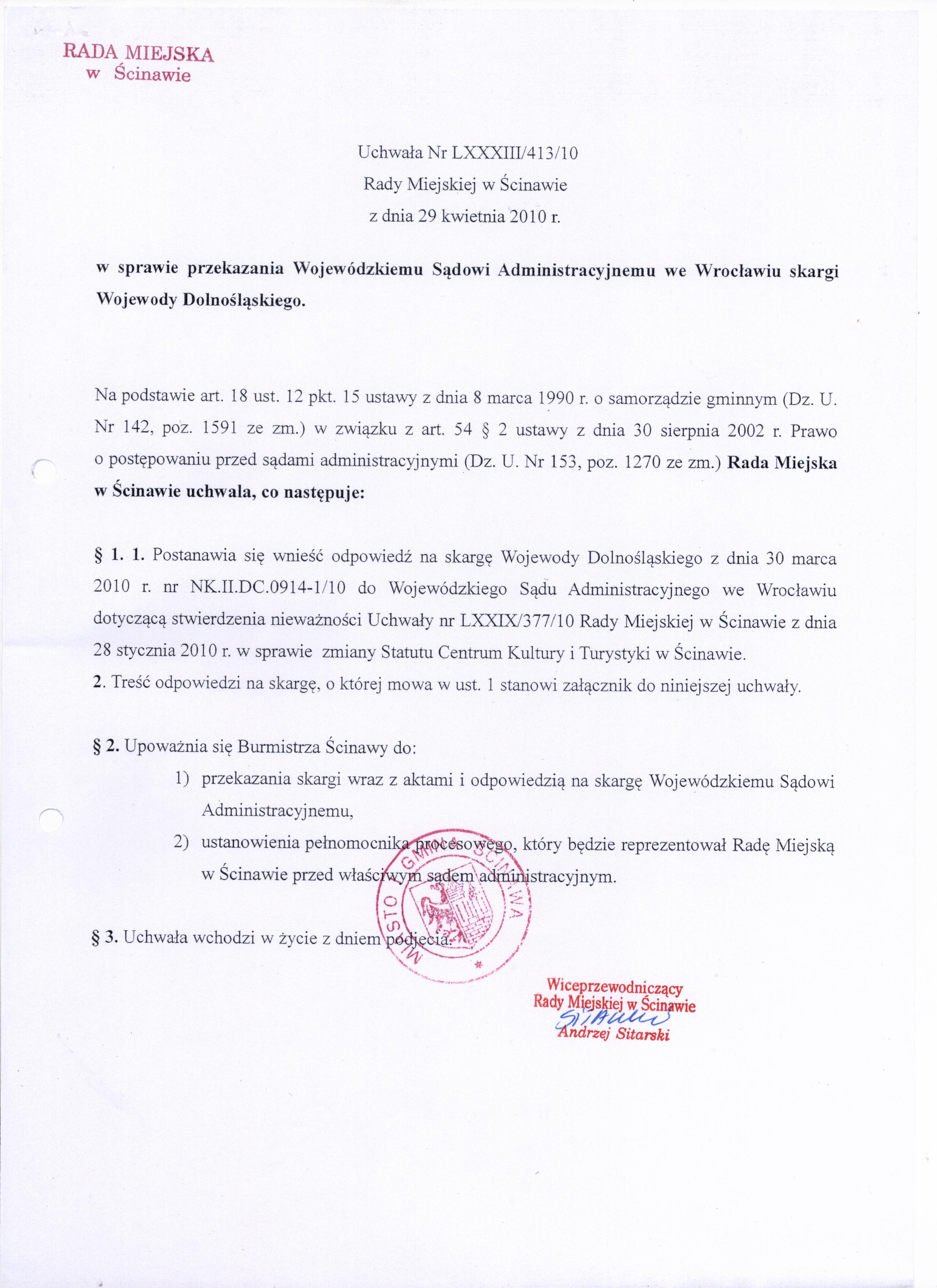 Uchwała nr LXXXIII/413/10 Rady Miejskiej w Ścinawie z dnia 29 kwietnia 2010r.