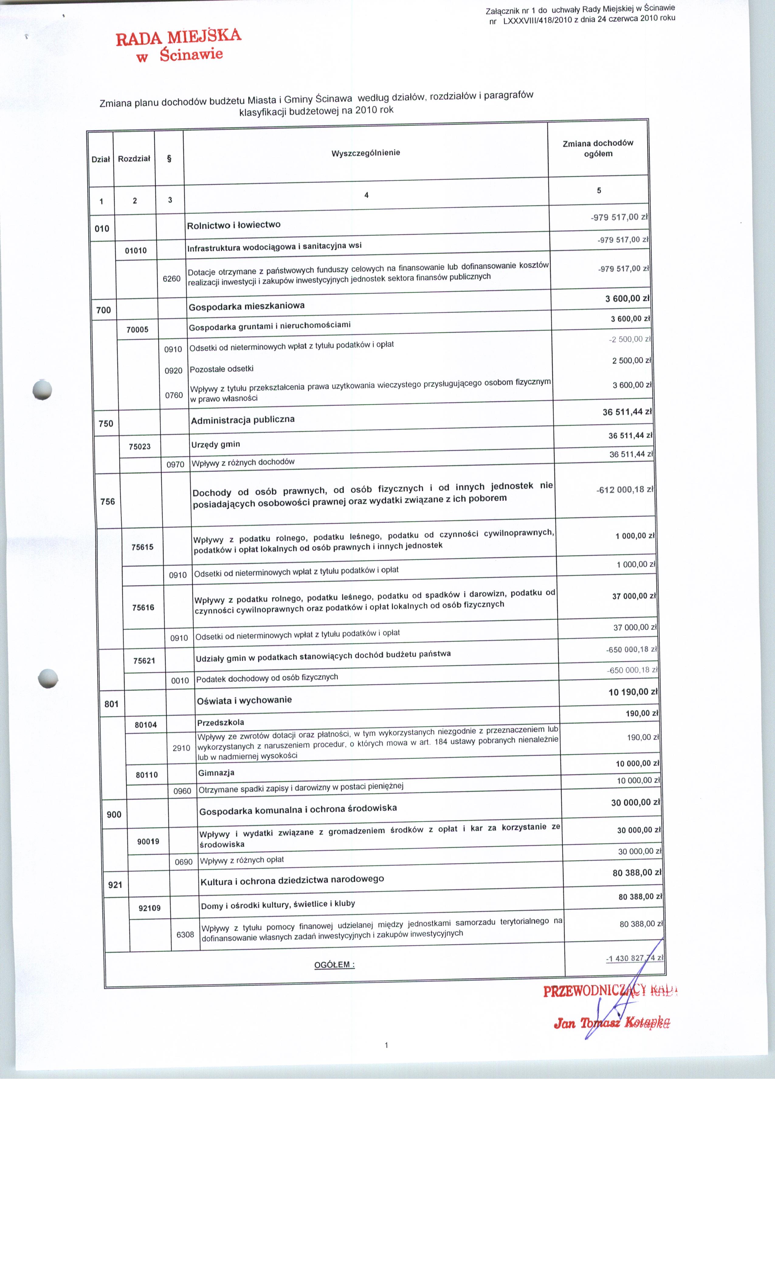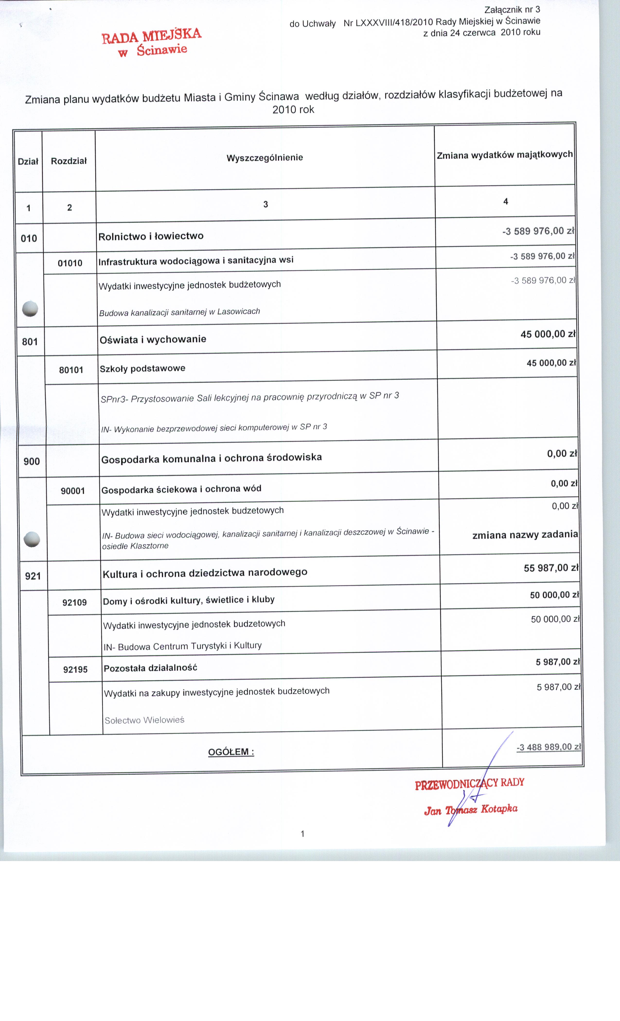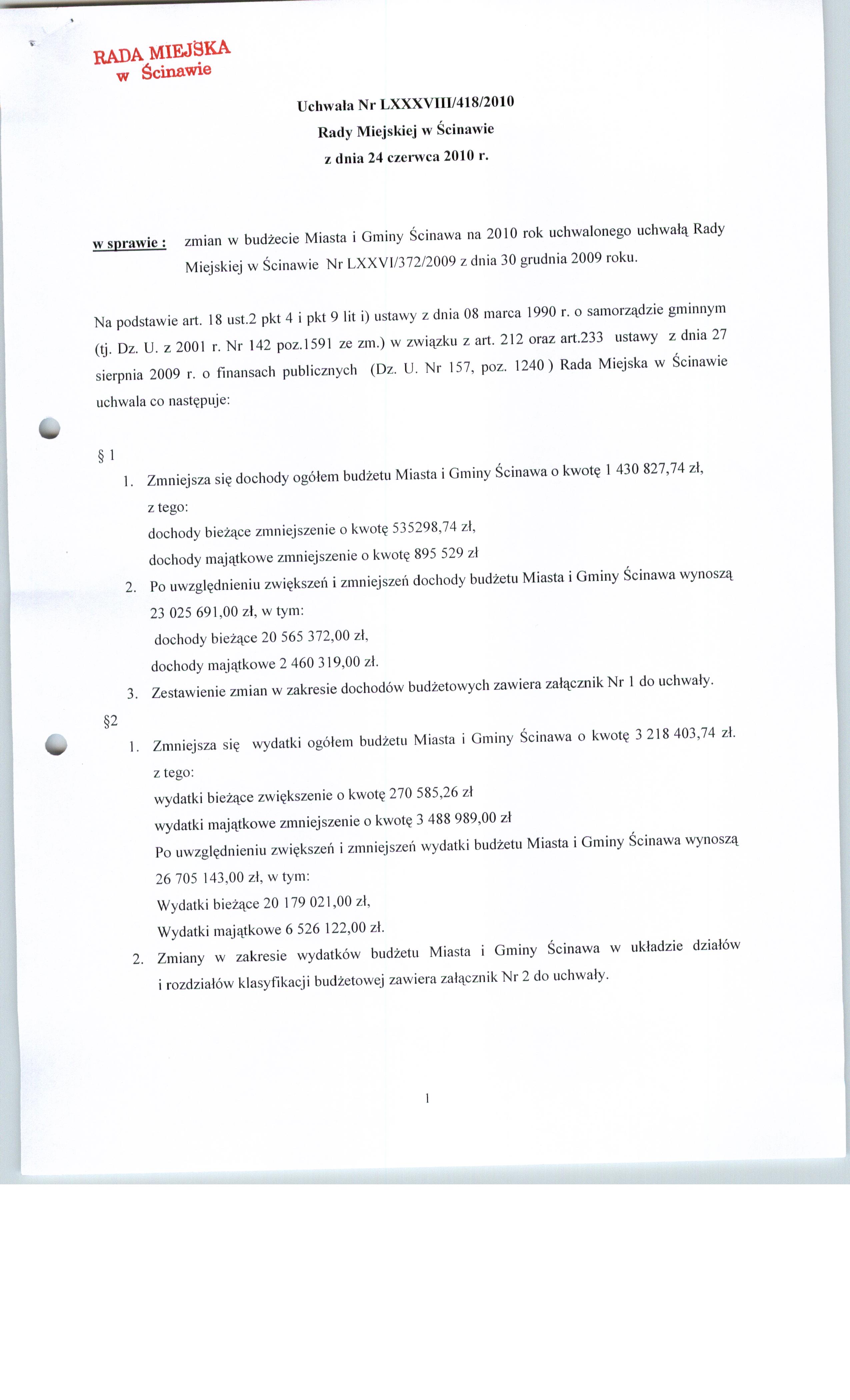 Uchwała nr LXXXVIII/418/10 Rady Miejskiej w Ścinawie z dnia 24 czerwca 2010r.