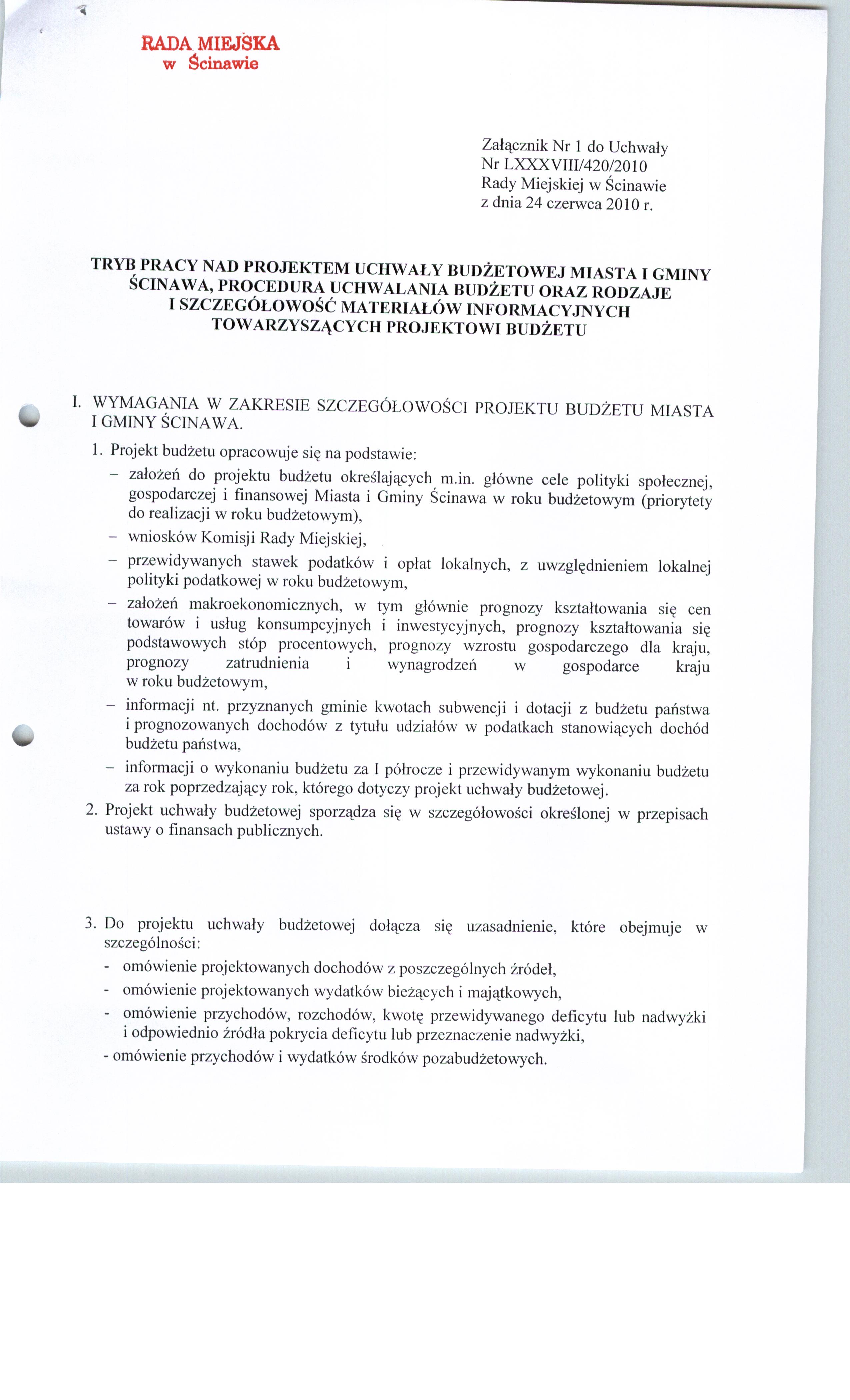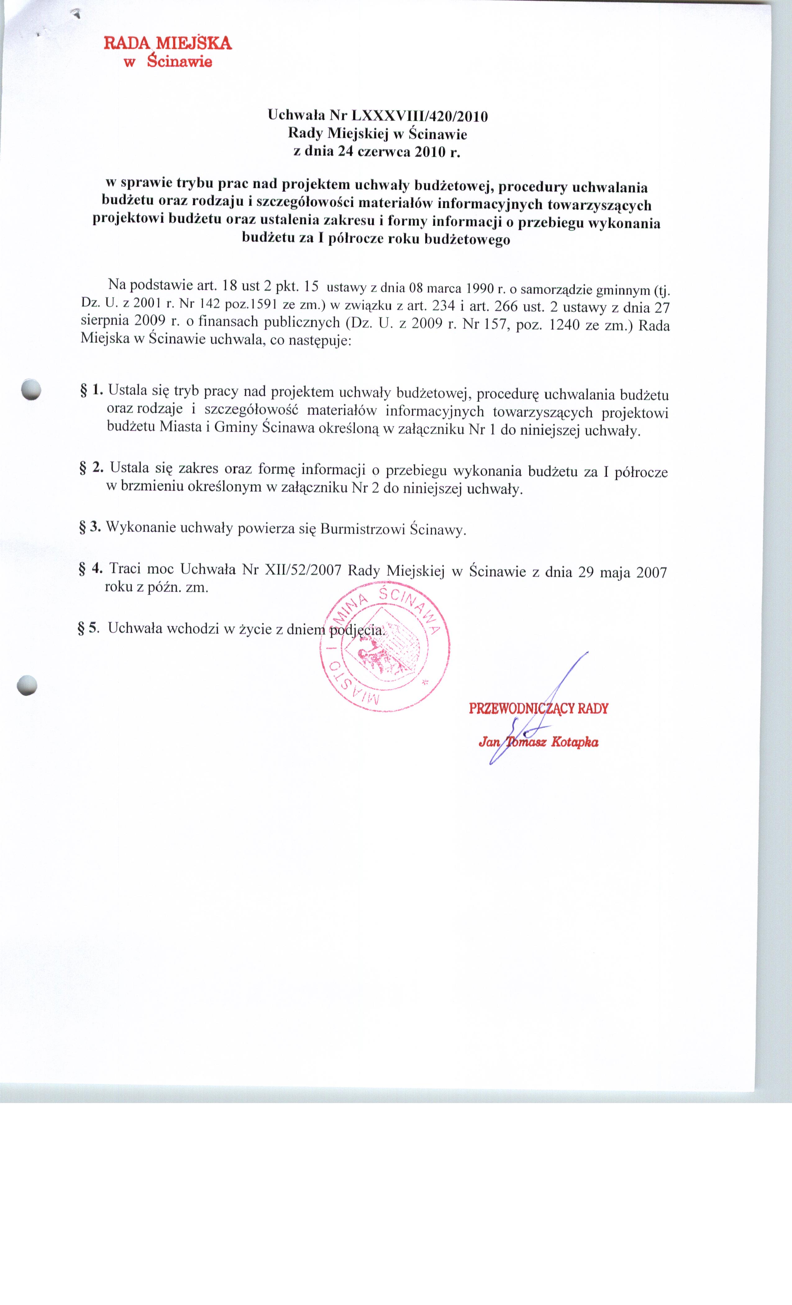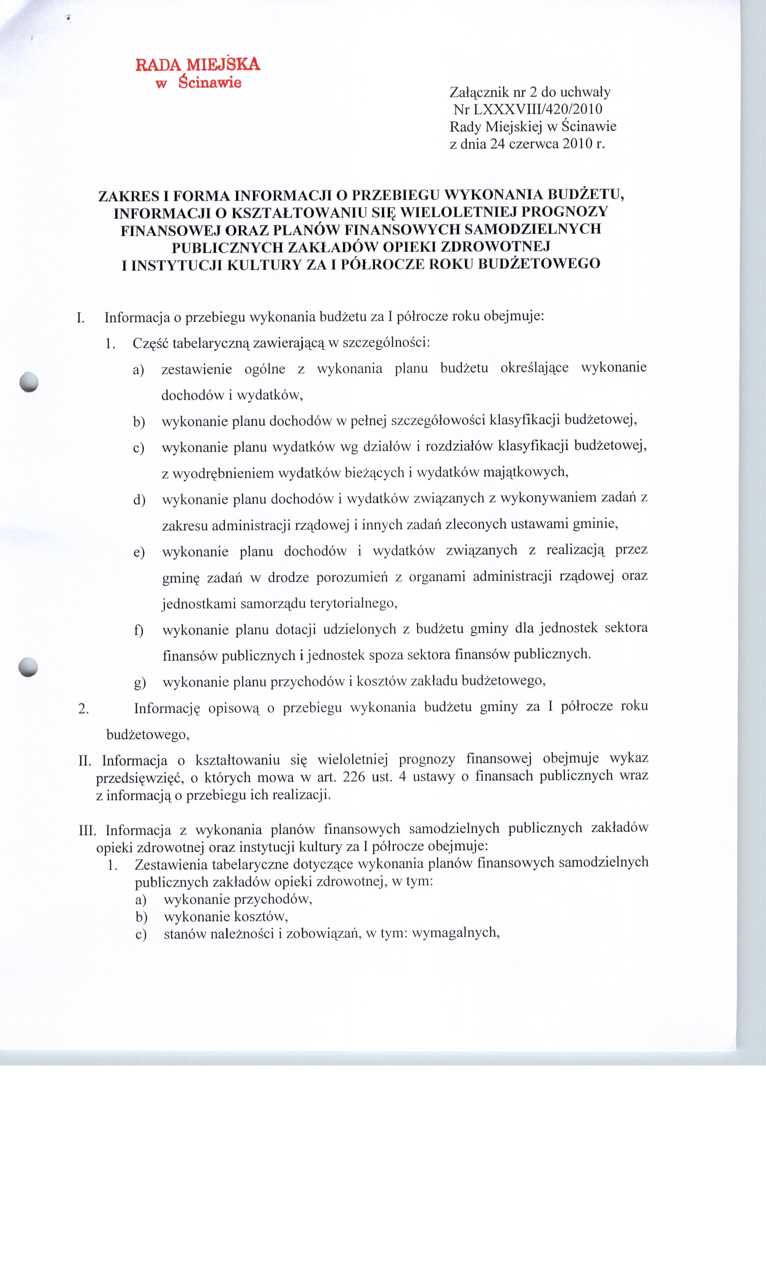 Uchwała nr LXXXVIII/420/10 Rady Miejskiej w Ścinawie z dnia 24 czerwca 2010r.