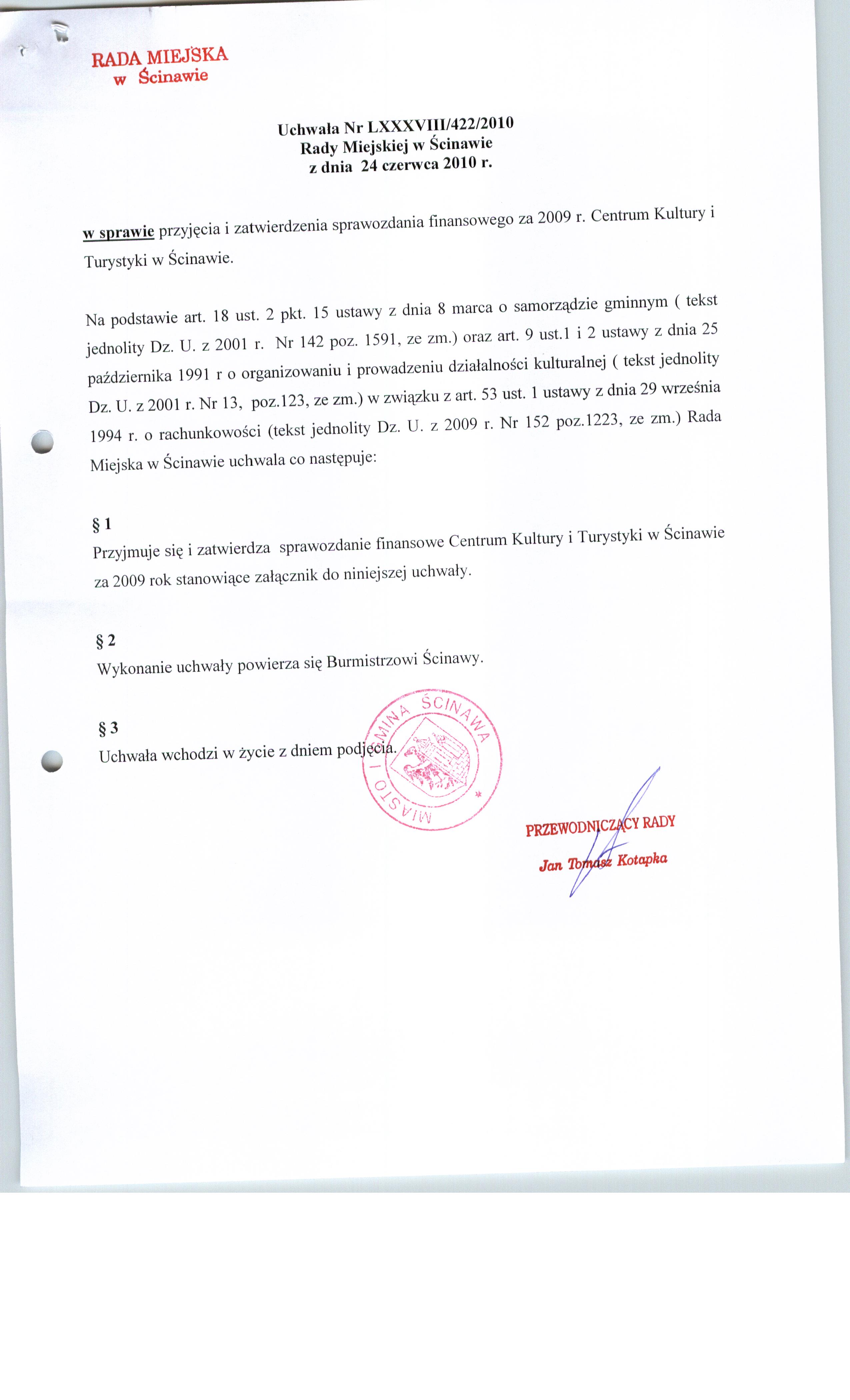 Tytuł dokumentu: | Uchwała nr LXXXVIII/422/10 Rady Miejskiej w Ścinawie z dnia 24 czerwca 2010r. | |