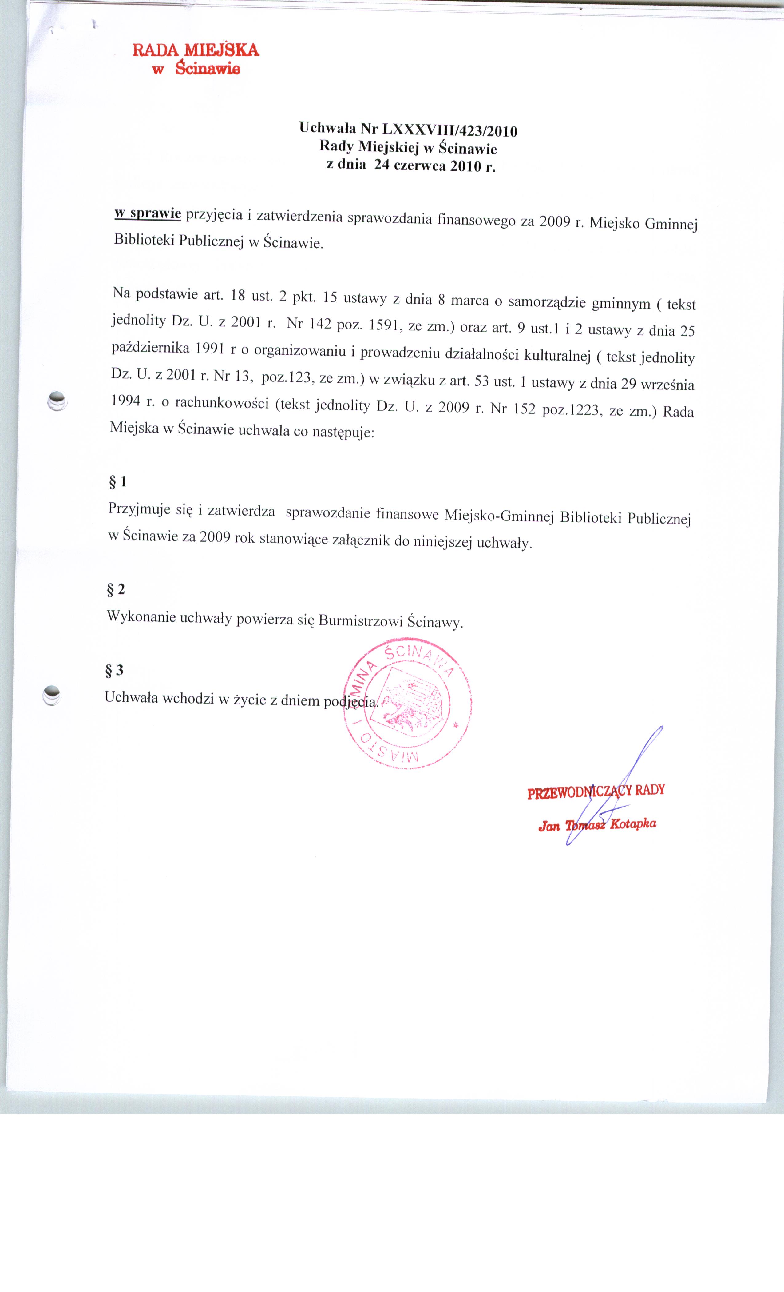 Tytuł dokumentu: | Uchwała nr LXXXVIII/423/10 Rady Miejskiej w Ścinawie z dnia 24 czerwca 2010r. | |