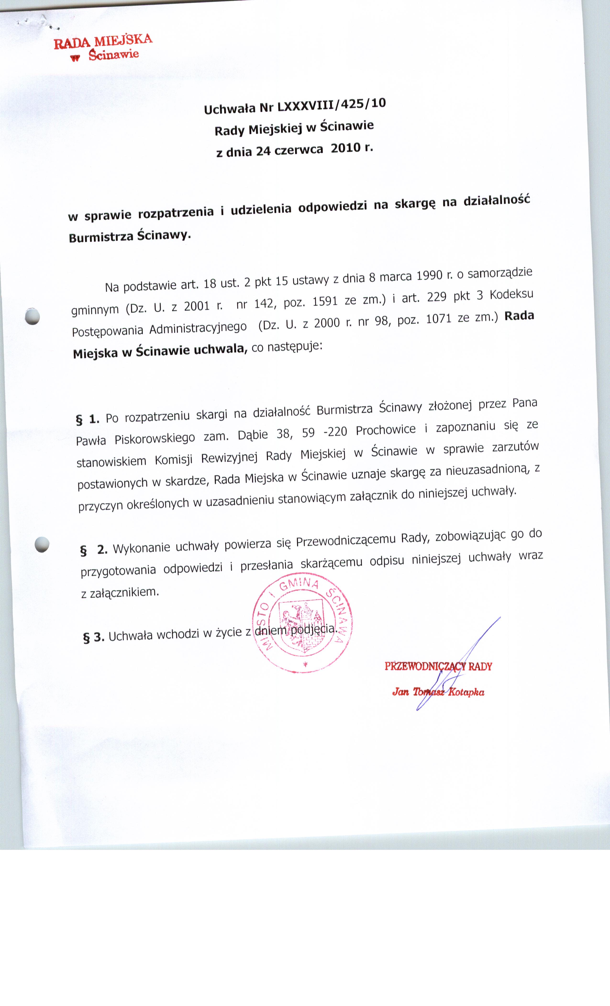 Tytuł dokumentu: | Uchwała nr LXXXVIII/425/10 Rady Miejskiej w Ścinawie z dnia 24 czerwca 2010r. | |