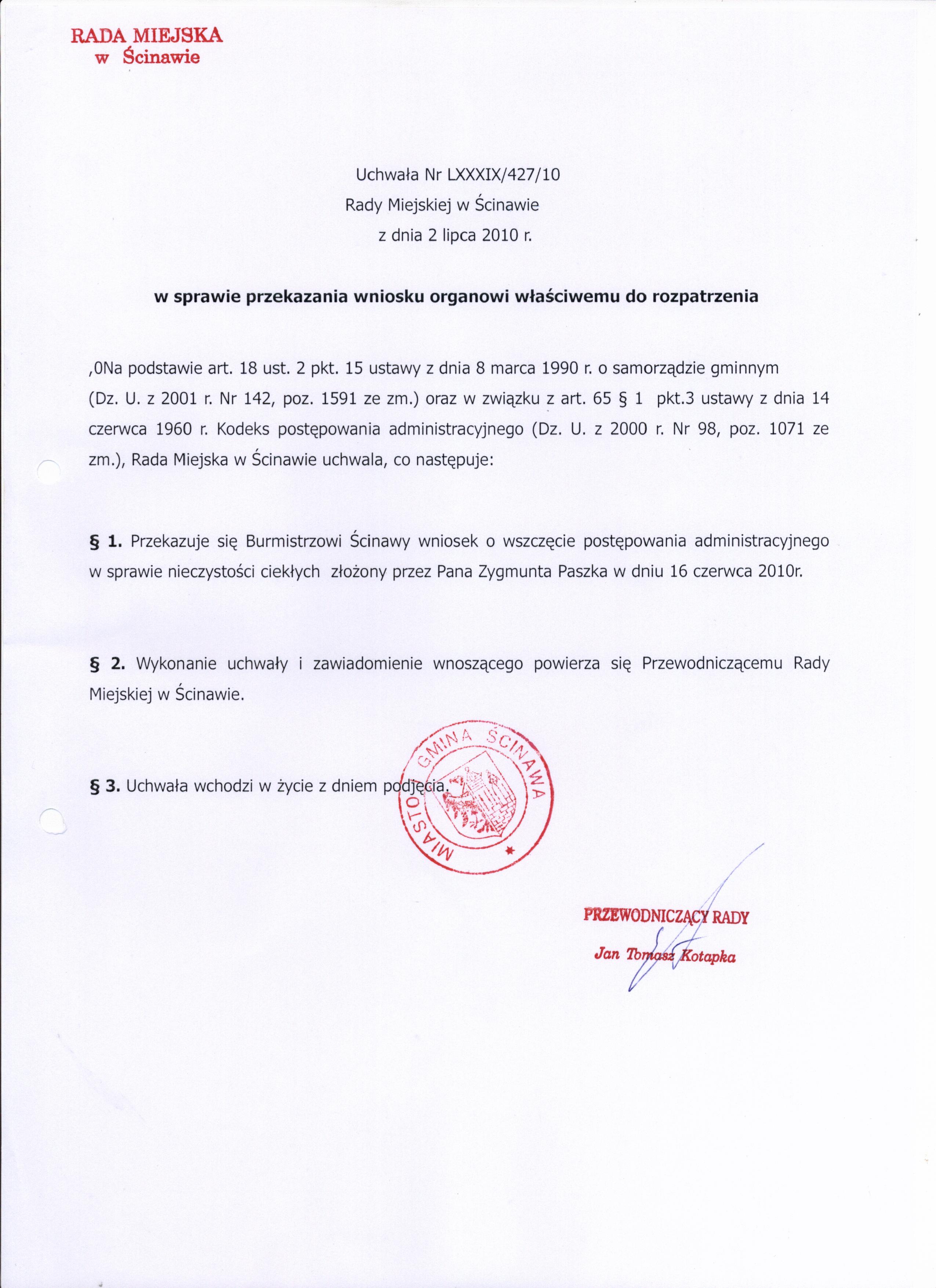 Tytuł dokumentu: | Uchwała nr LXXXIX/427/10 Rady Miejskiej w Ścinawie z dnia 2 lipca 2010r. | |