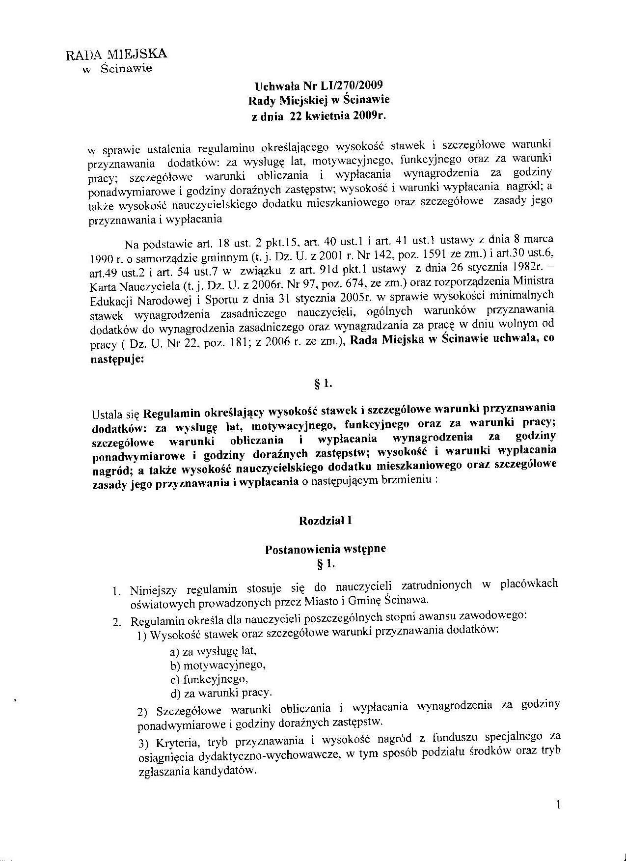 Uchwała nr LI/270/09 Rady Miejskiej w Ścinawie z dnia 22 kwietnia 2009r.