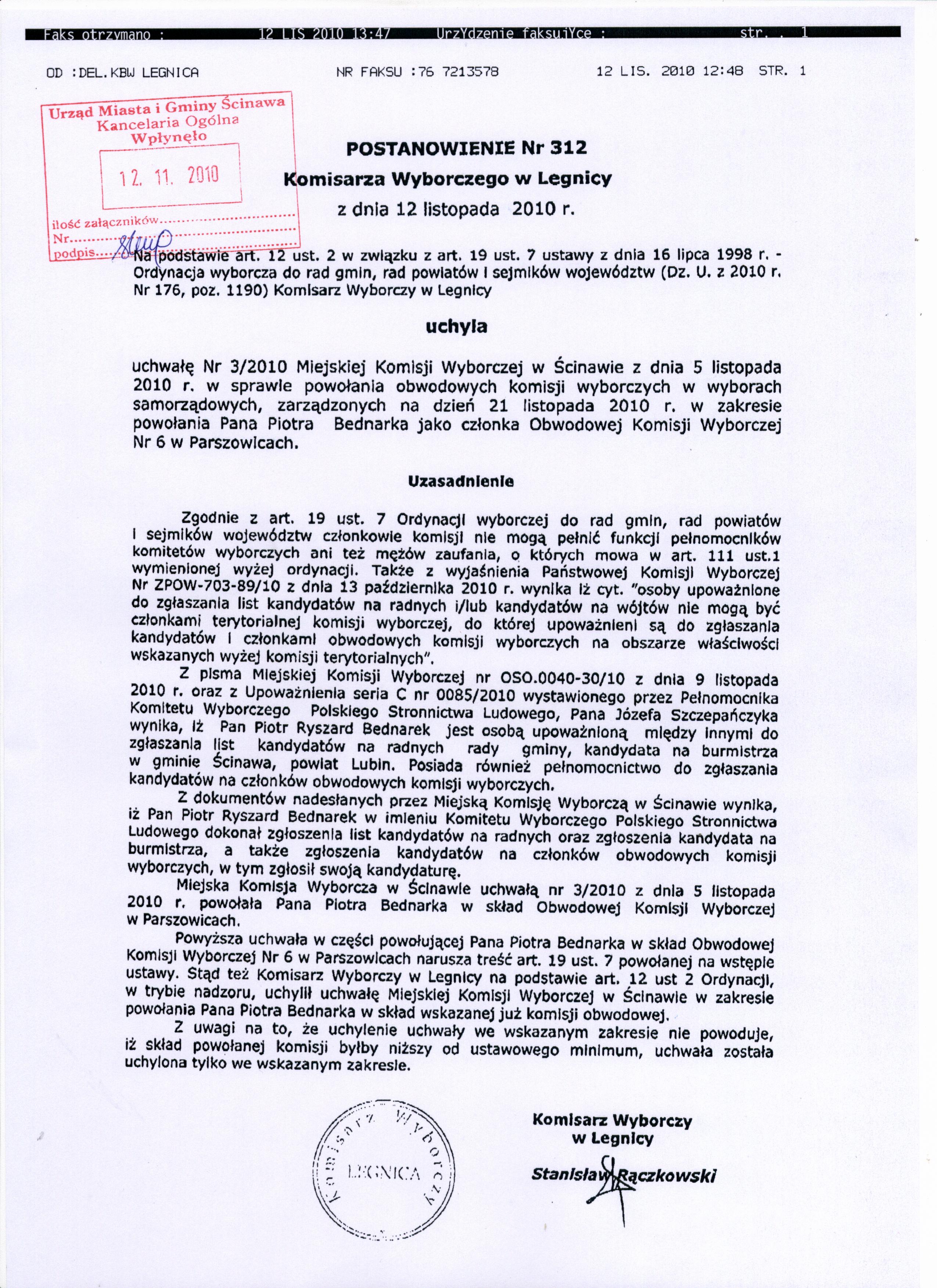 Tytuł dokumentu: | Postanowienie Komisarza Wyborczego nr 312 z dnia 12 listopada 2010 r. | |