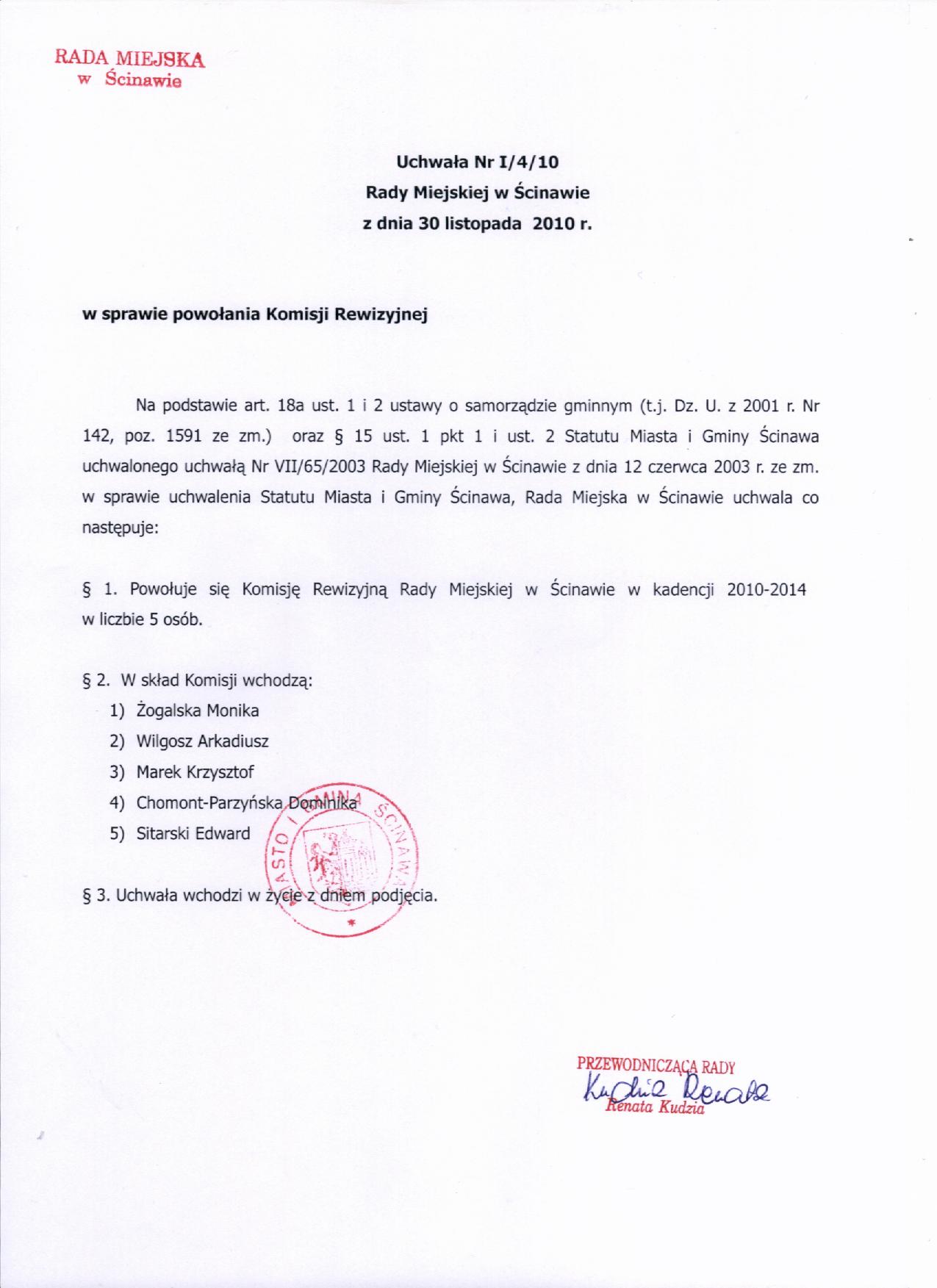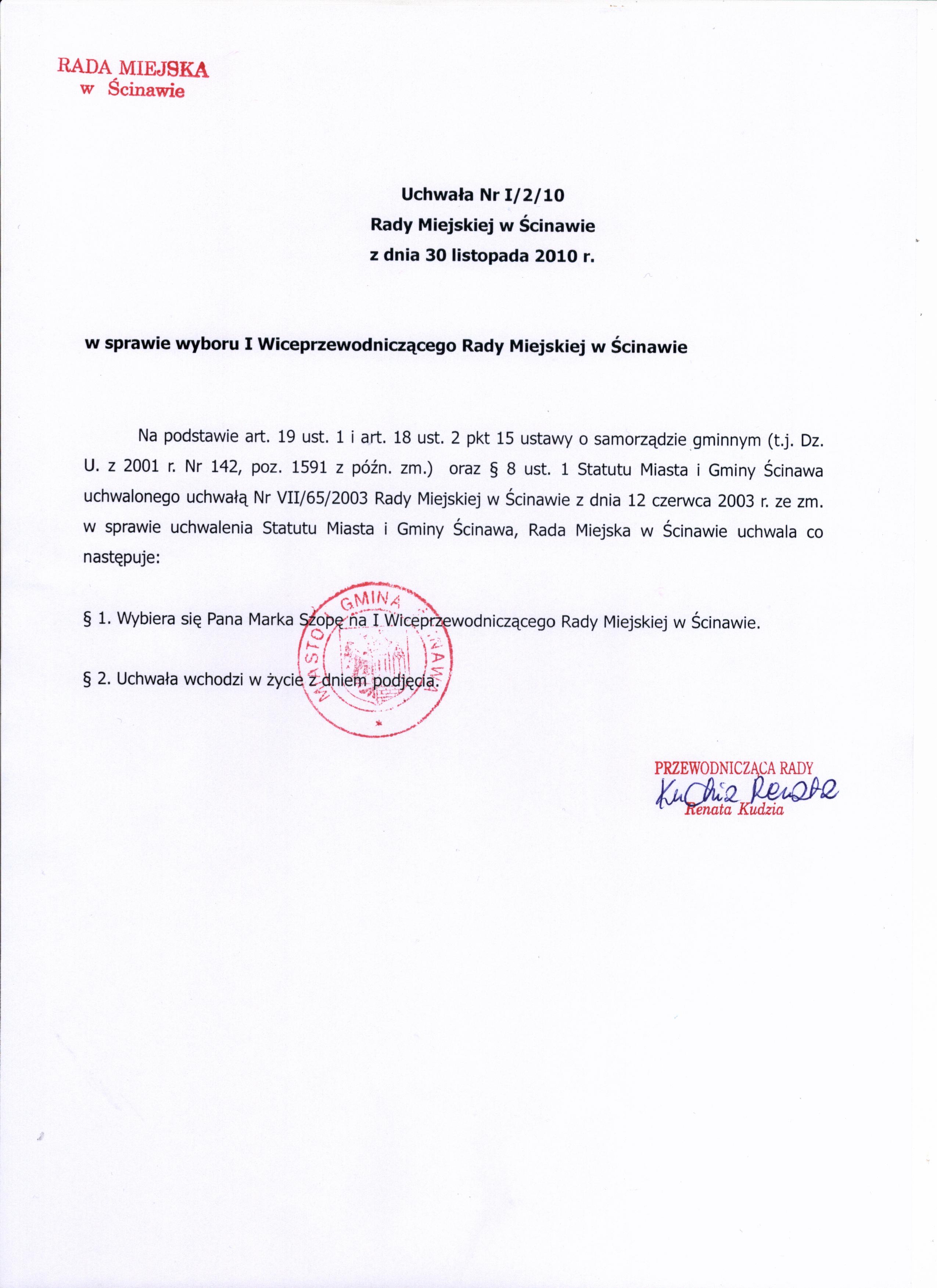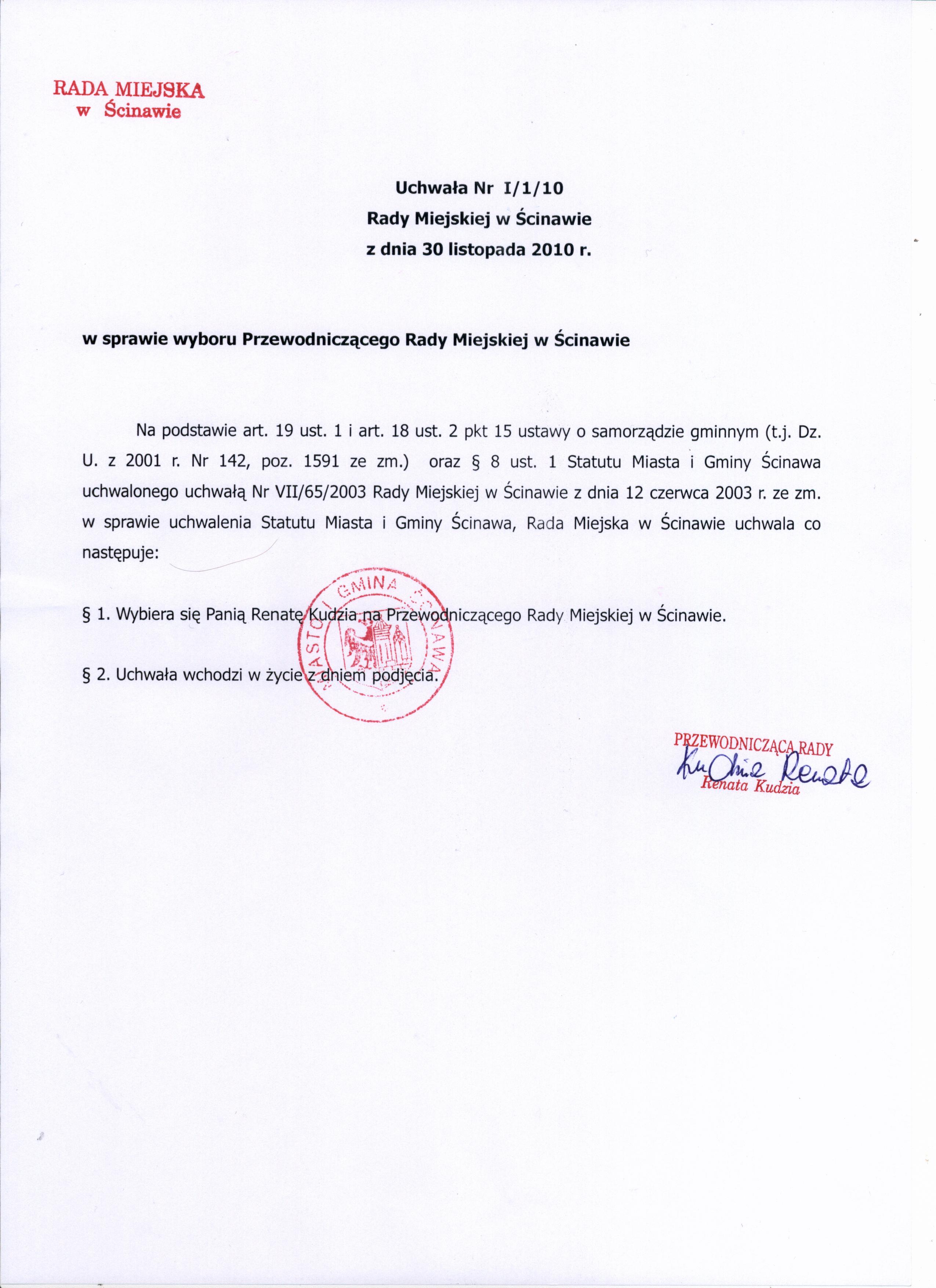 Uchwały Rady Miejskej w Ścinawie - I sesja z dnia 30 listopada 2010 r.