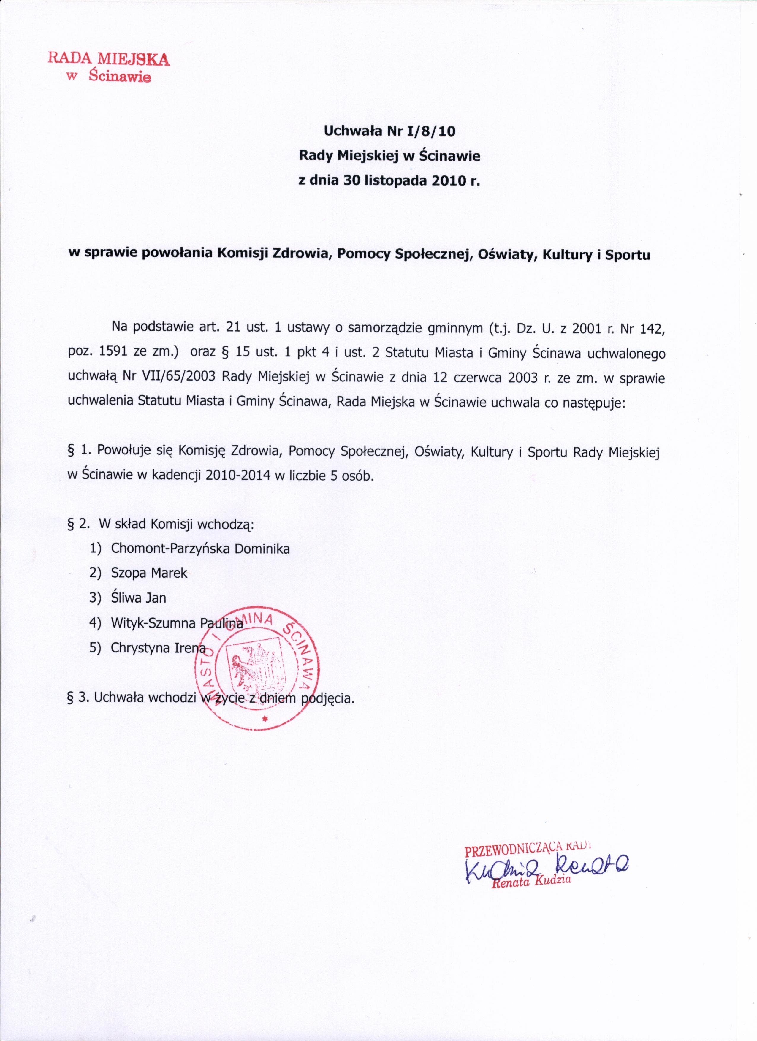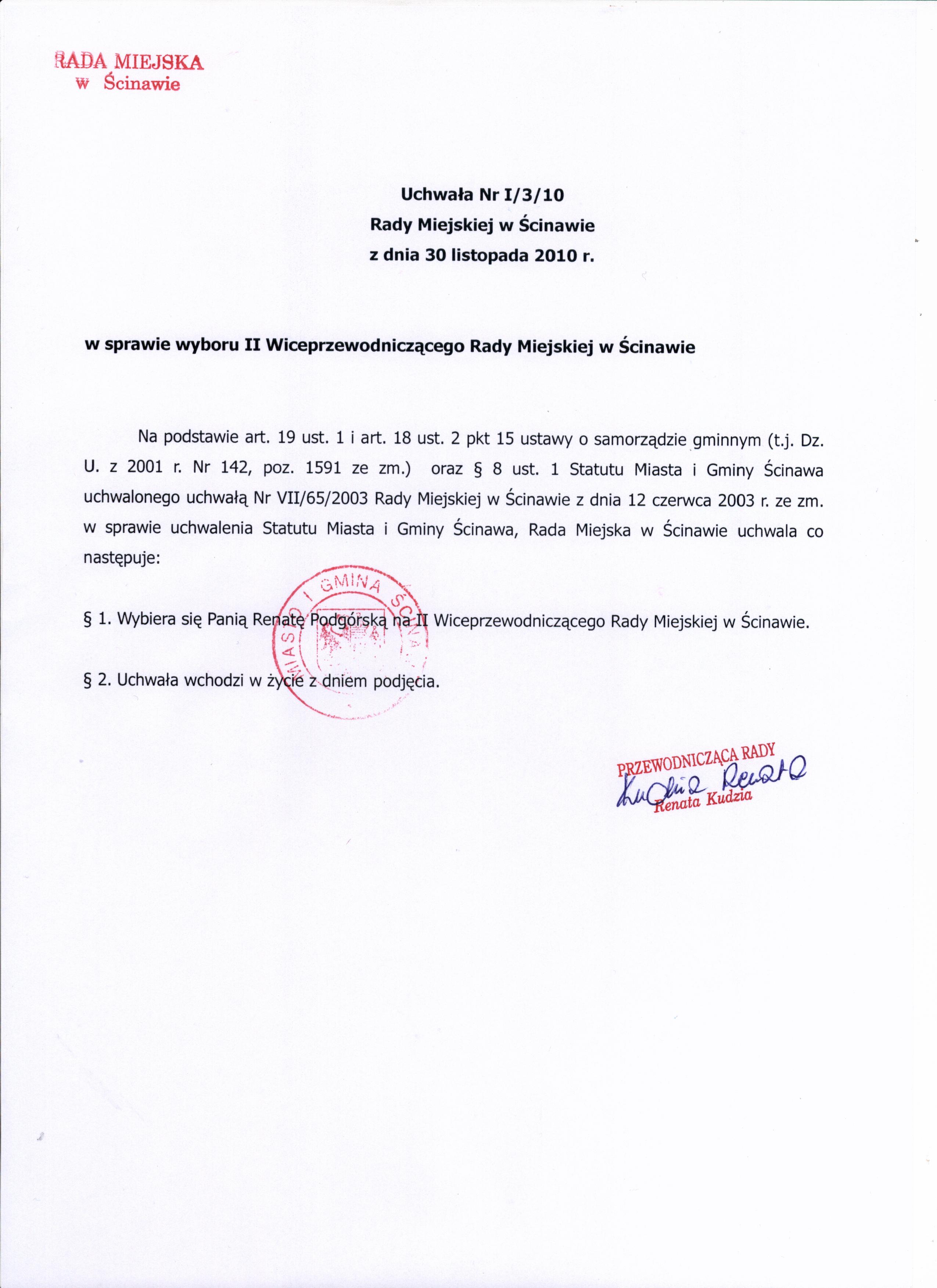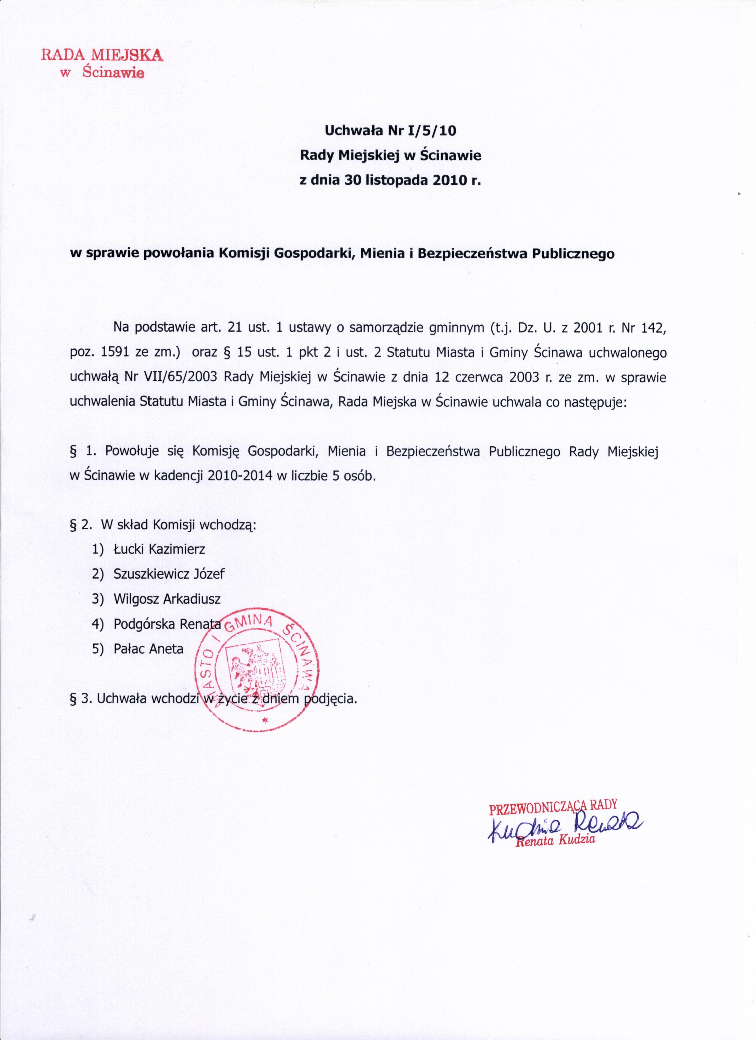 Uchwały Rady Miejskej w Ścinawie - I sesja z dnia 30 listopada 2010 r.