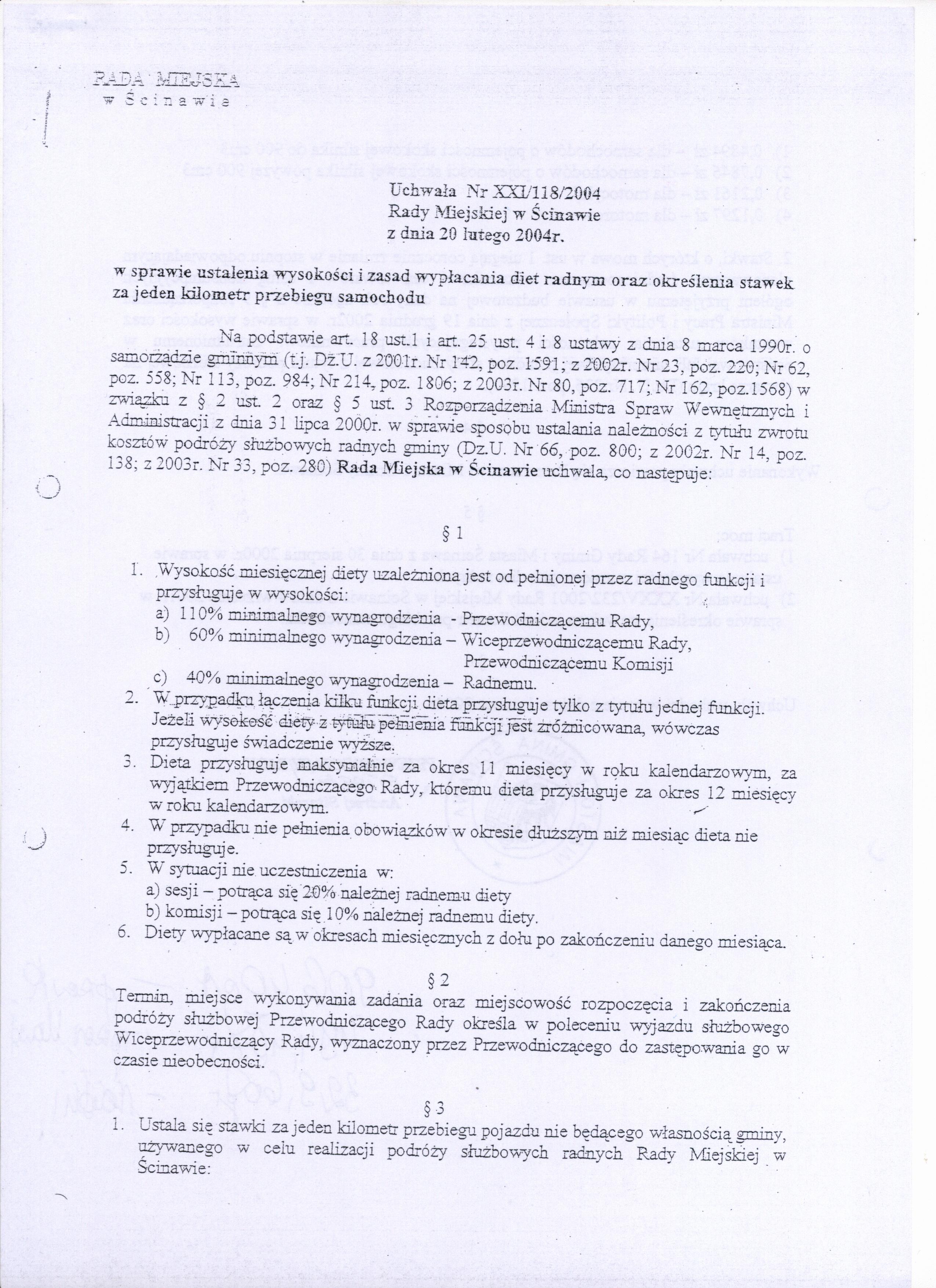 Uchwała Nr XXI/118/2004 z dnia 20 lutego 2004 r. w sprawie ustalenia wysokości i zasad wypłacania diet radnym oraz okreslenia stawek za jeden kilometr przebiegu samochodu [1] (18.01.2011)