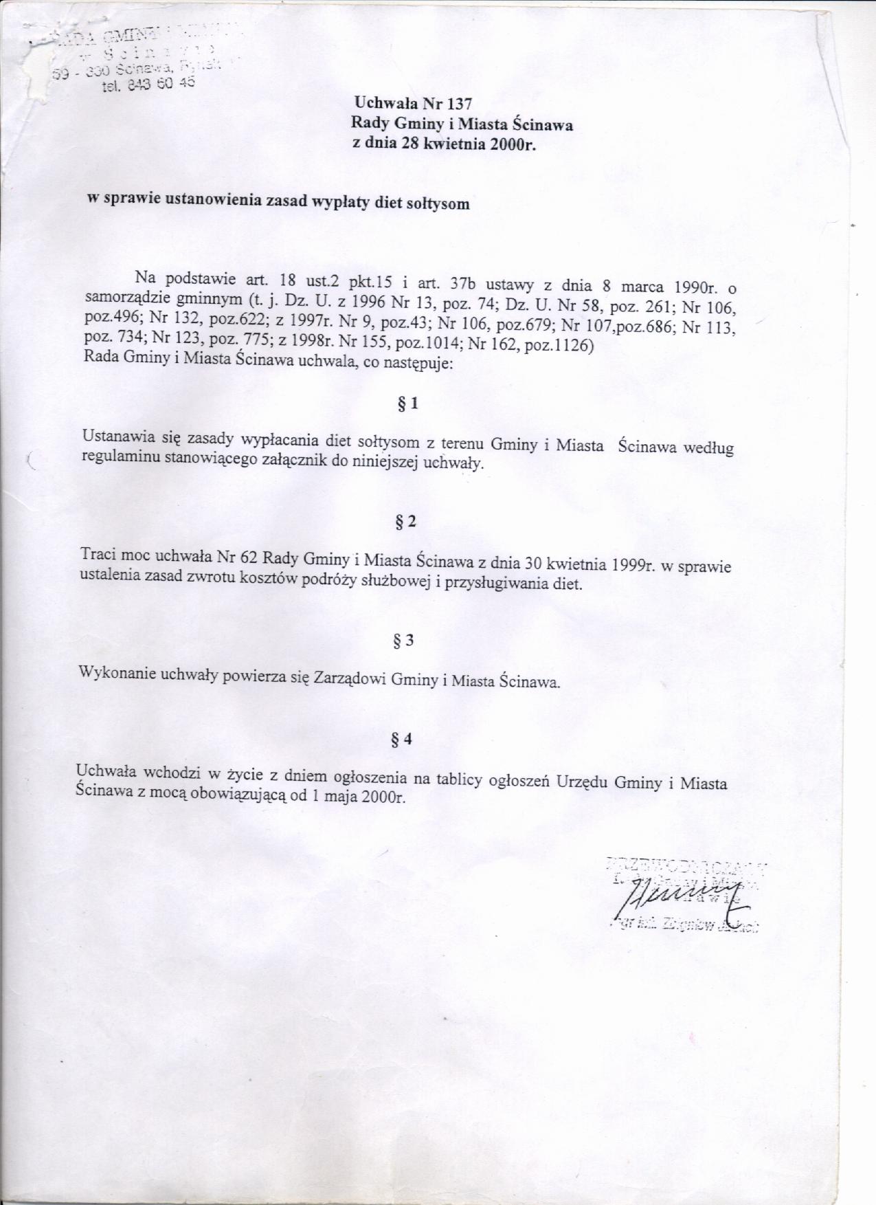 Uchwała Nr 137 Rady Gminy i Miasta Ścinawa z dnia 28 kwietnia
