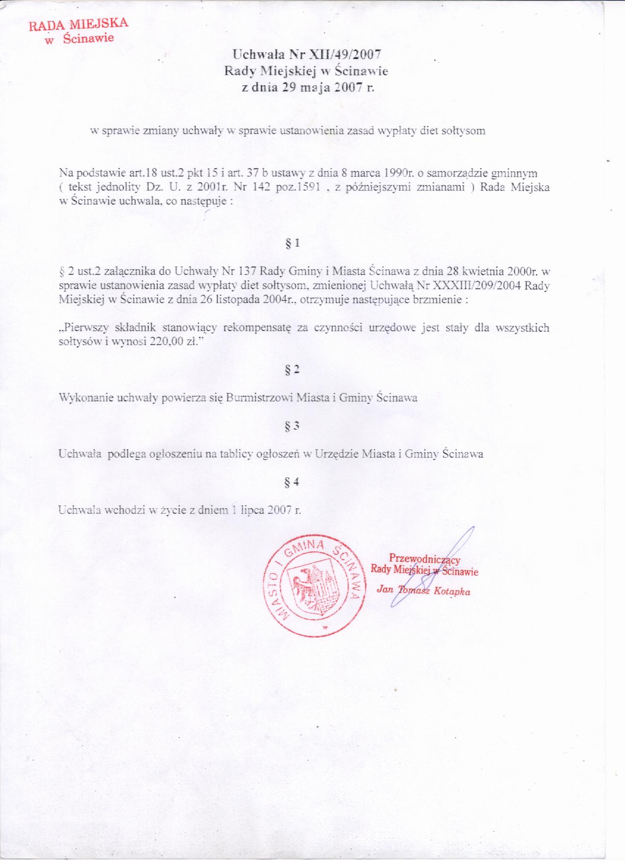 Uchwała Nr XII/49/2007 Rady Miejskiej w Ścinawie z dnia 29
